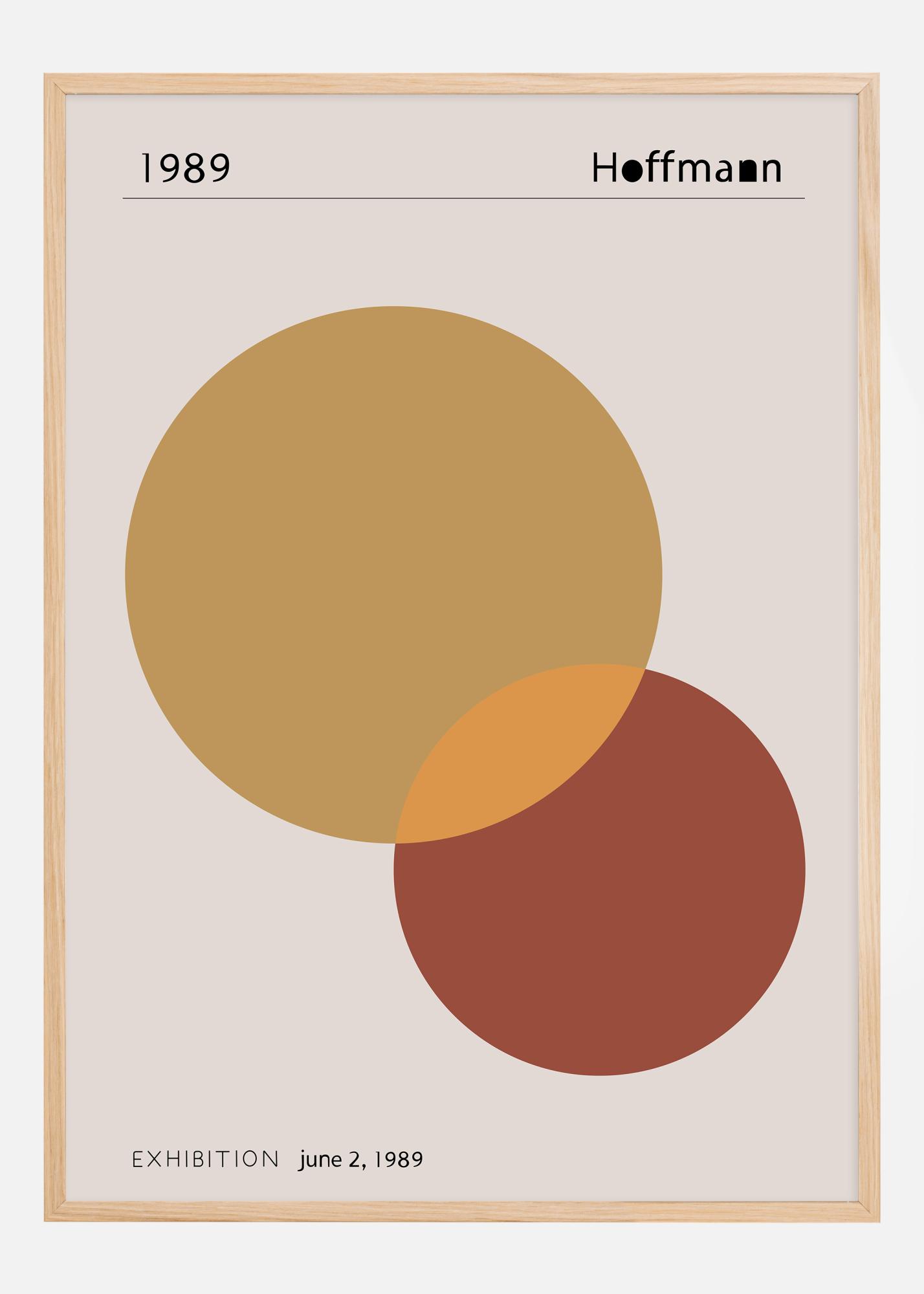 Această poster minimalist și sofisticat celebrează expoziția artistului abstract Hoffmann din 1989. Cu un design elegant compus din cercuri suprapuse în nuanțe calde de maro și ocru, acest poster creează o senzație atât de retro cât și de modernitate. Textul este plasat discret pentru a oferi spațiu vizualului, unde fiecare element este atent echilibrat pentru a crea o operă de artă plină de atmosferă și invitație.