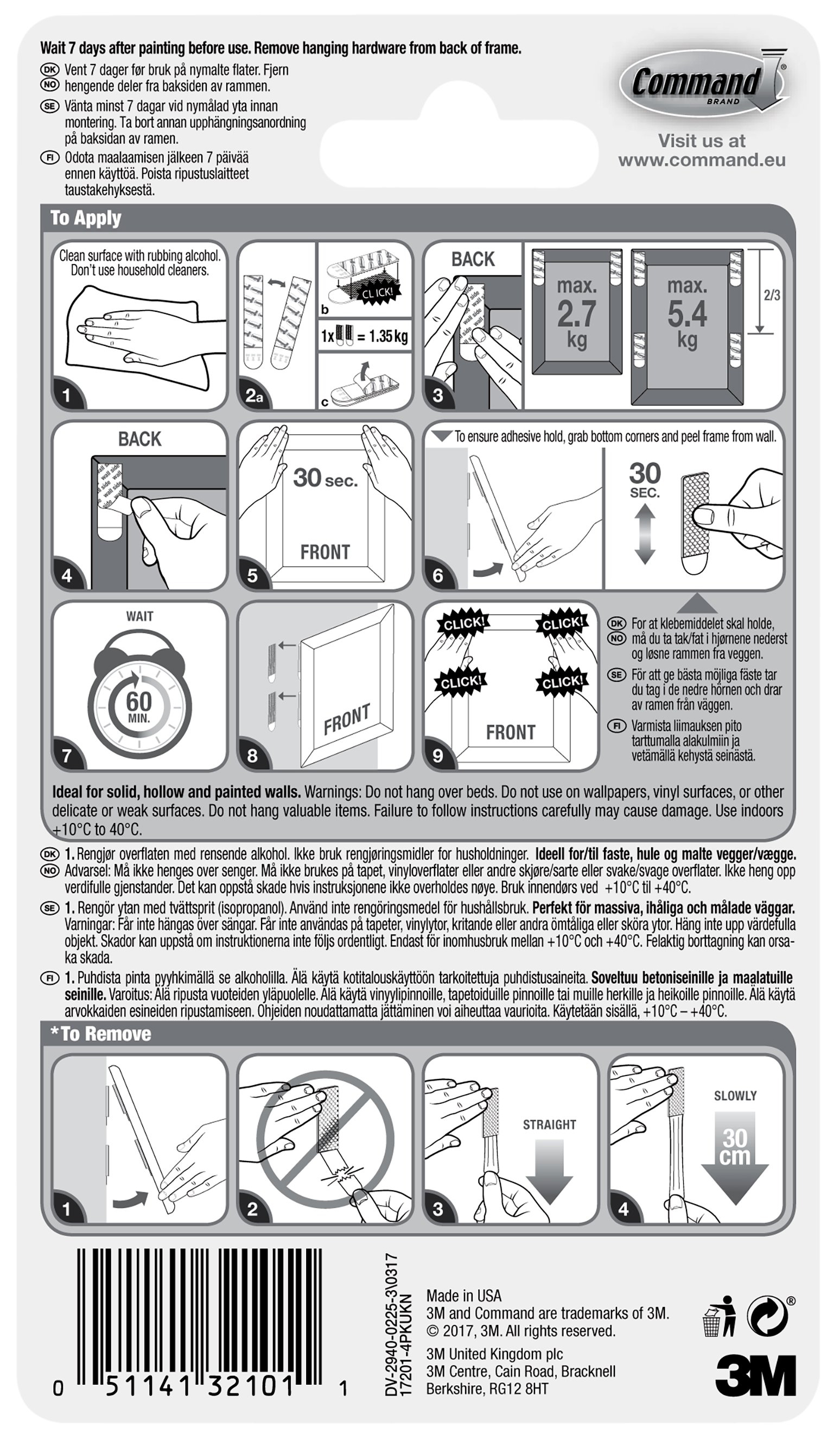 Cu aceste suporturi pentru tablouri de la Command, poți monta cu ușurință ramele foto fără a fi nevoie să găurești sau să bati cuie în perete. Suporturile sunt autoadezive și nu lasă urme la îndepărtare, datorită tehnologiei inovatoare de eliberare cu întindere de la 3M. Acestea sunt perfecte pentru utilizarea pe majoritatea suprafețelor netede, cum ar fi pereții vopsiți, plăcile ceramice, metalul și lemnul. Benzile de fixare nu ar trebui utilizate pe tapet, materiale vinilice sau alte suprafețe delicate.