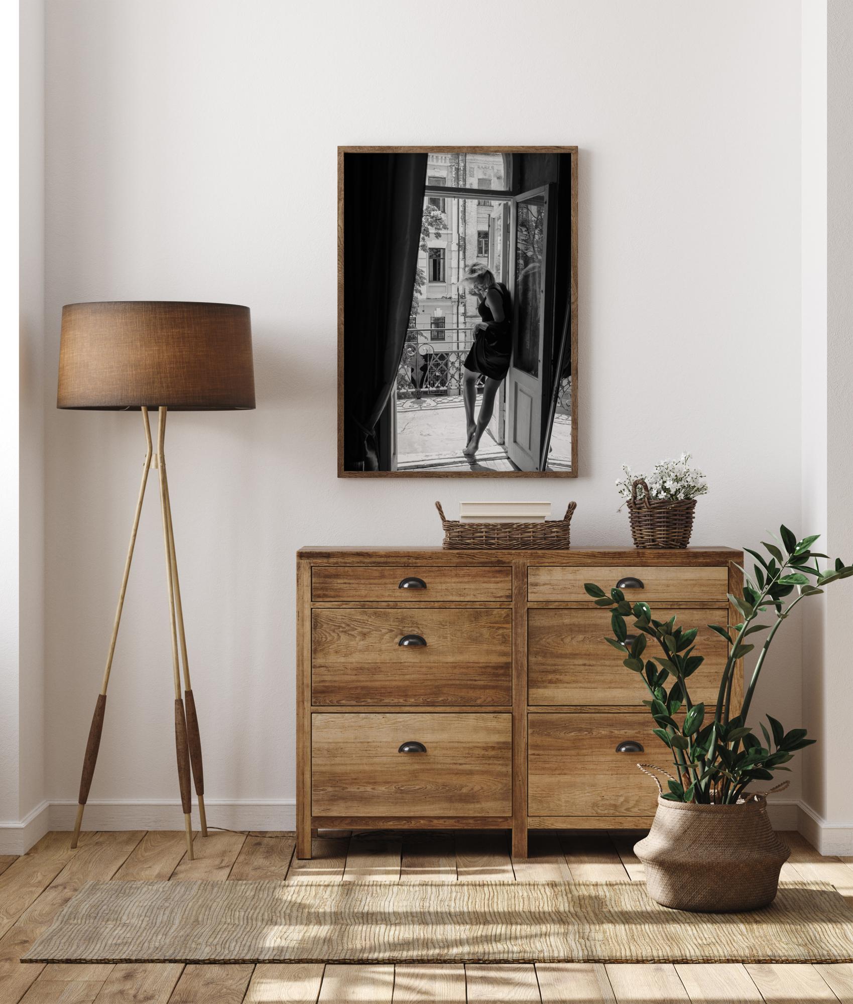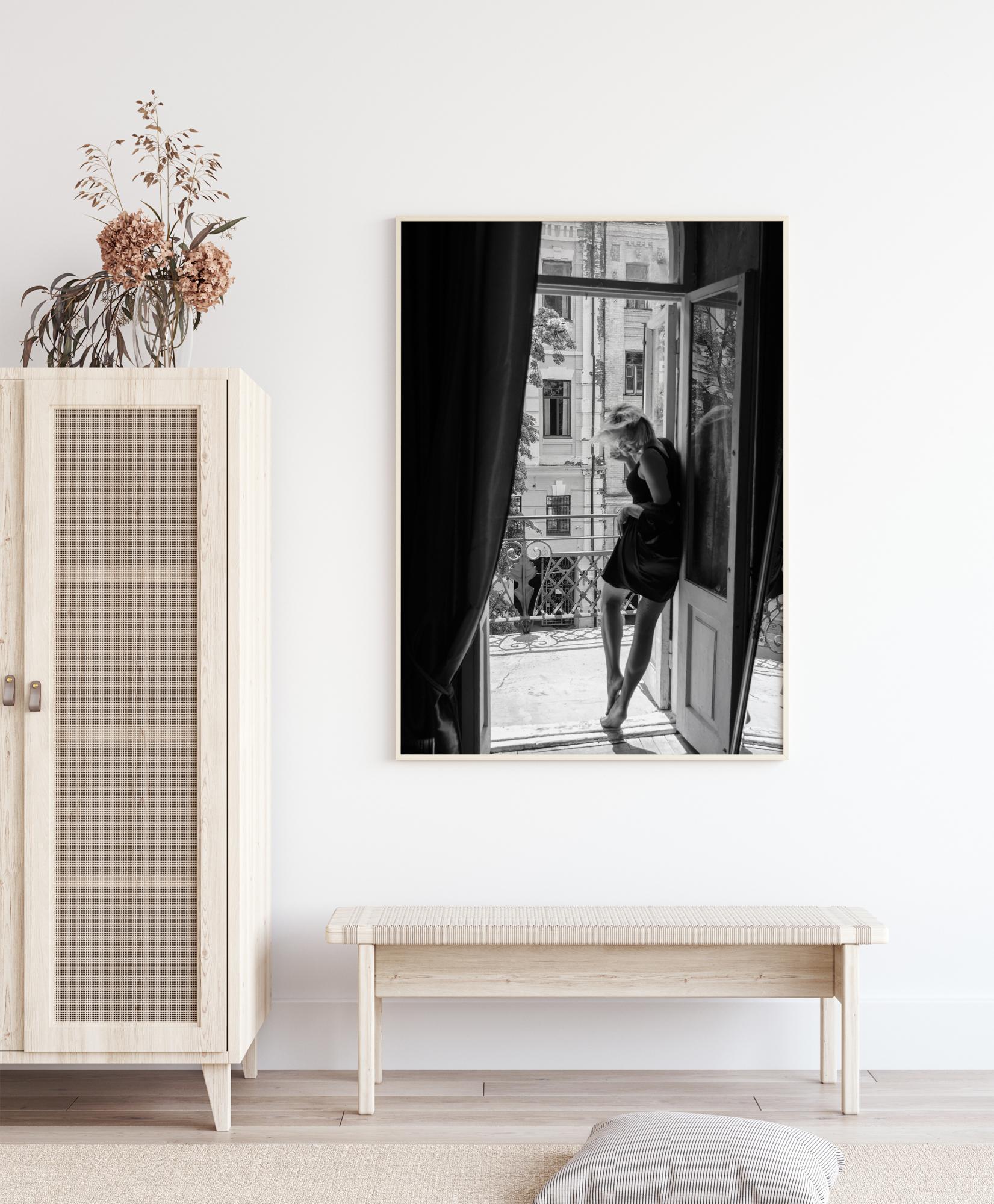 Un poster clasic cu o femeie pe un balcon din Paris. Femeia poartă o rochie neagră care îi alungeste picioarele goale, sprijinindu-se de o ușă, în timp ce stă pe vârfuri și își privește picioarele. Combină acest poster alb-negru cu un perete într-o culoare deschisă pentru a aduce o notă de eleganță.