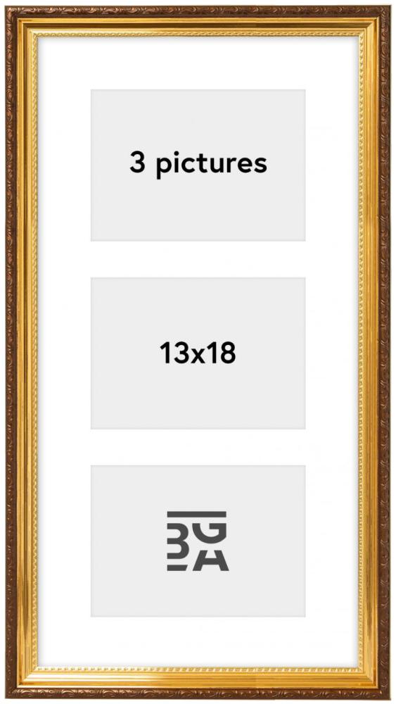 Cu această ramă de colaj îți poți decora peretele cu fotografii ale familiei, prietenilor și amintiri din momente frumoase ale vieții. Rama are spațiu pentru 3 fotografii de dimensiunea 13x18 cm. Rama aurie are un stil retro frumos, cu o margine exterioară decorativă într-o nuanță caldă de maro. Suport de perete inclus.