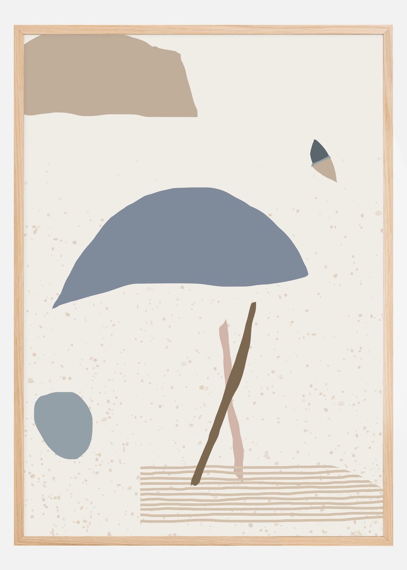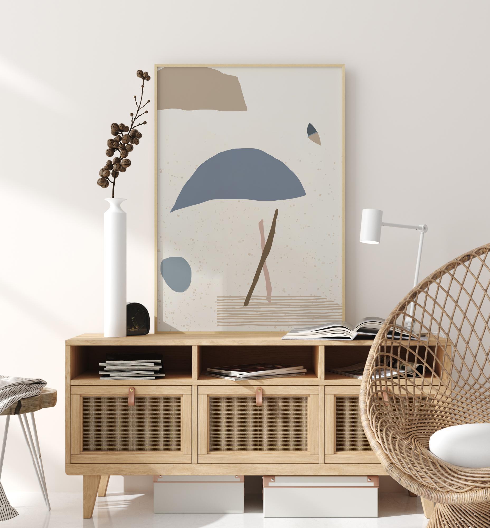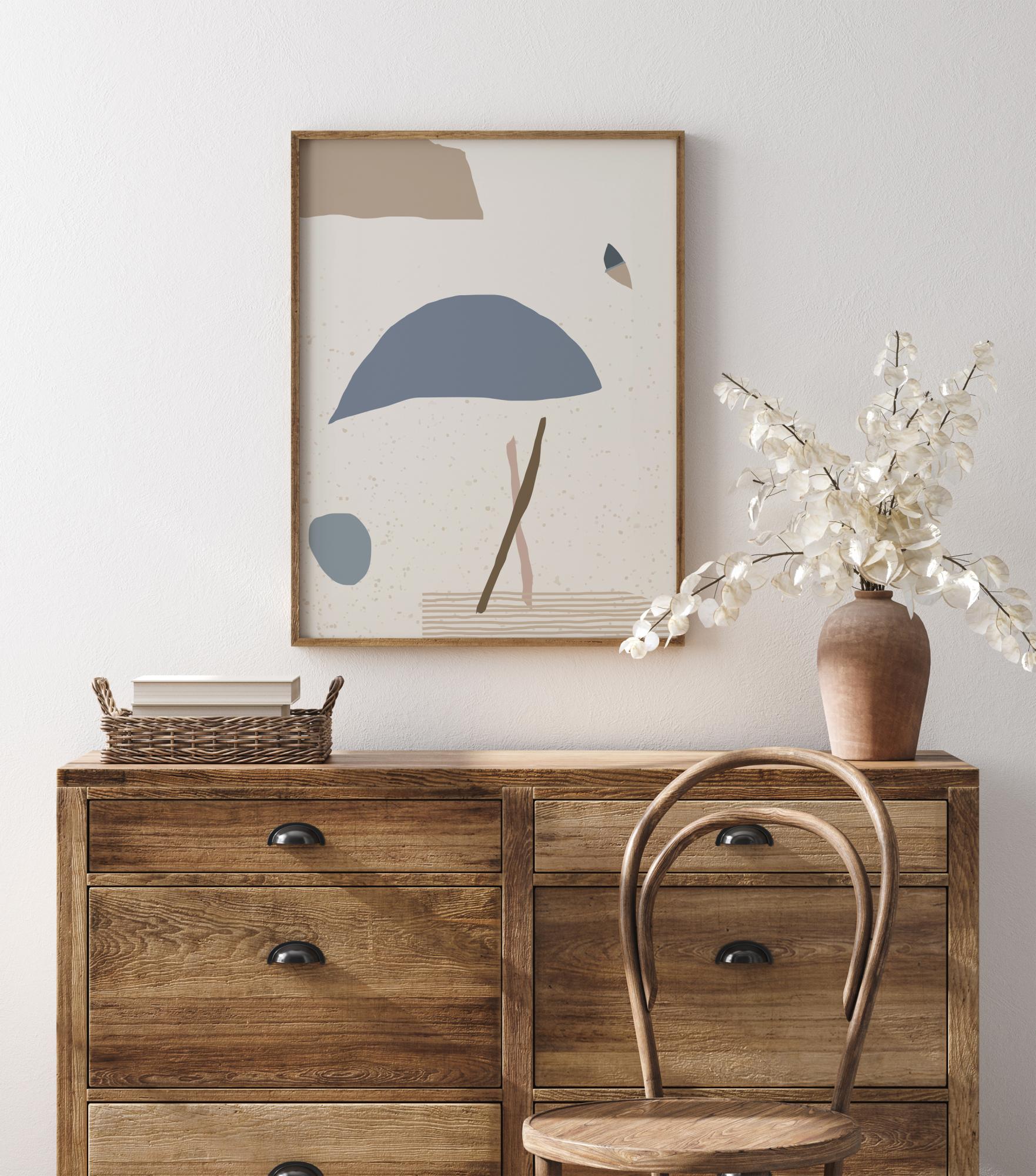 Un poster abstract cu forme albastre, maro și gri pe un fundal alb. Vezi ceea ce vrei să vezi în această lucrare minimalistă, care dă senzația unei persoane, a unei umbrele, a unei mingi, a unui fluture sau a unui nor. Adu galeria în casa ta cu acest poster contemplativ și încurajează discuția despre semnificația sa.