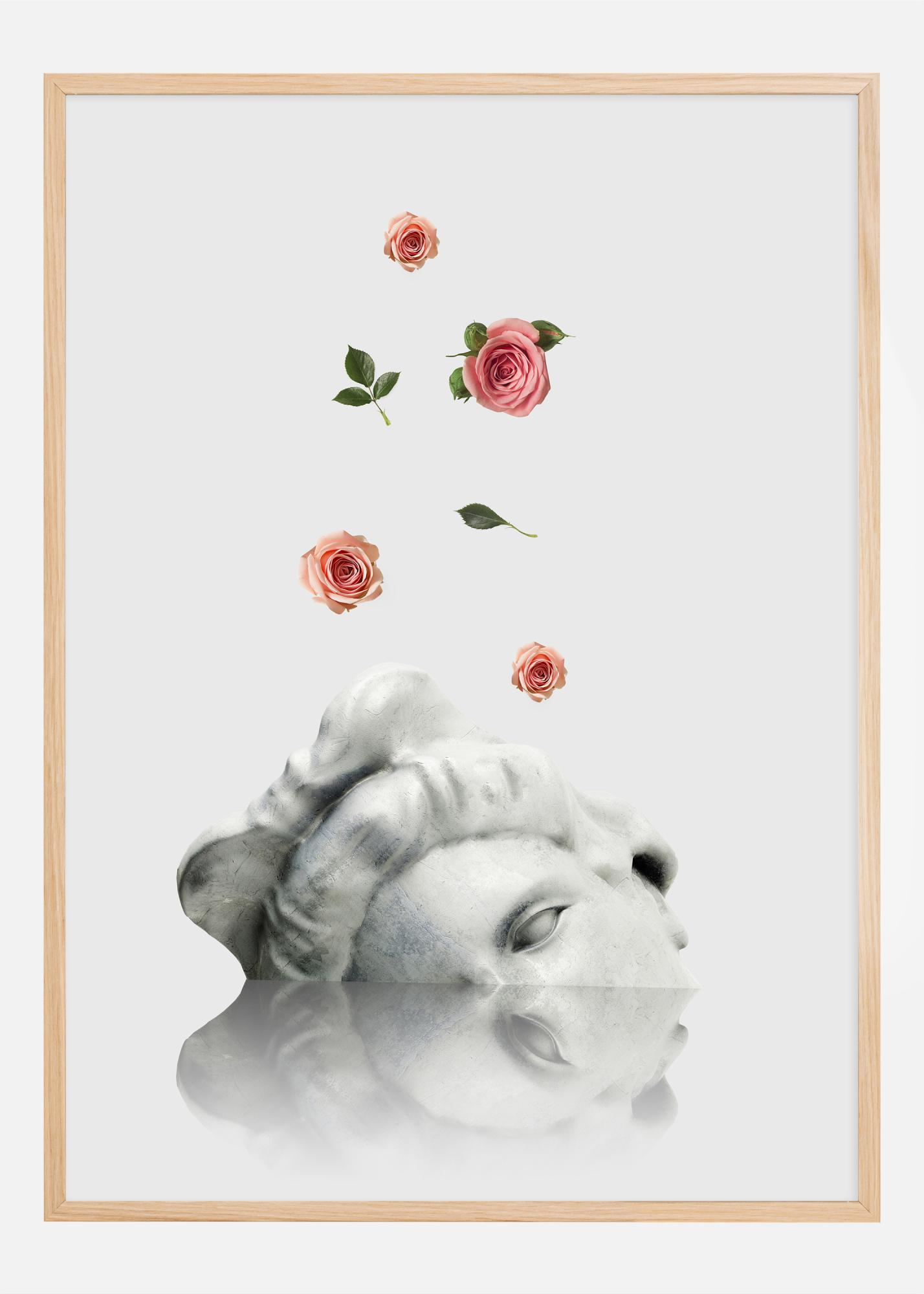 Această poster artistică prezintă o compoziție visătoare în care o sculptură a unui chip, care pare să se scufunde sau să se dizolve, este înconjurată de trandafiri învârtiți în diferite stadii de înflorire și frunziș. Este o imagine captivantă care unește frumusețea pietrei și a florei, oferind o senzație de atemporalitate și efemeritate.