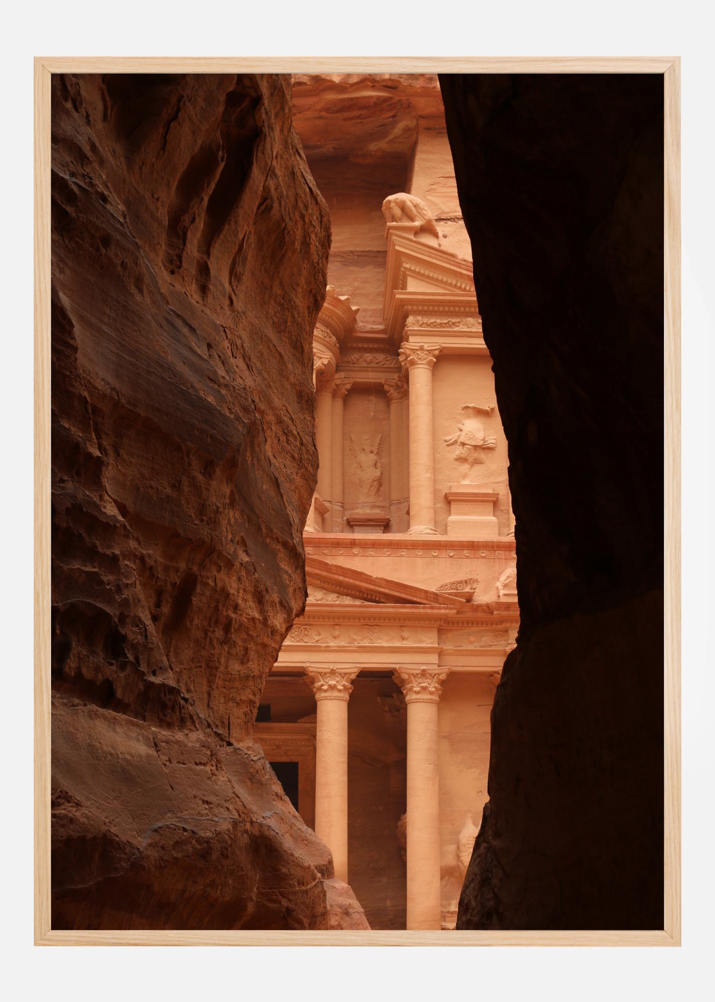 Un poster de reper cu un colț din Petra, Iordania. Privește o parte din fațadă prin stâncile roșii ale acestei minuni uimitoare din antichitate. Agață-l acasă și călătorește fără să părăsești casa, în timp ce explorezi arhitectura veche a acestui faimos.