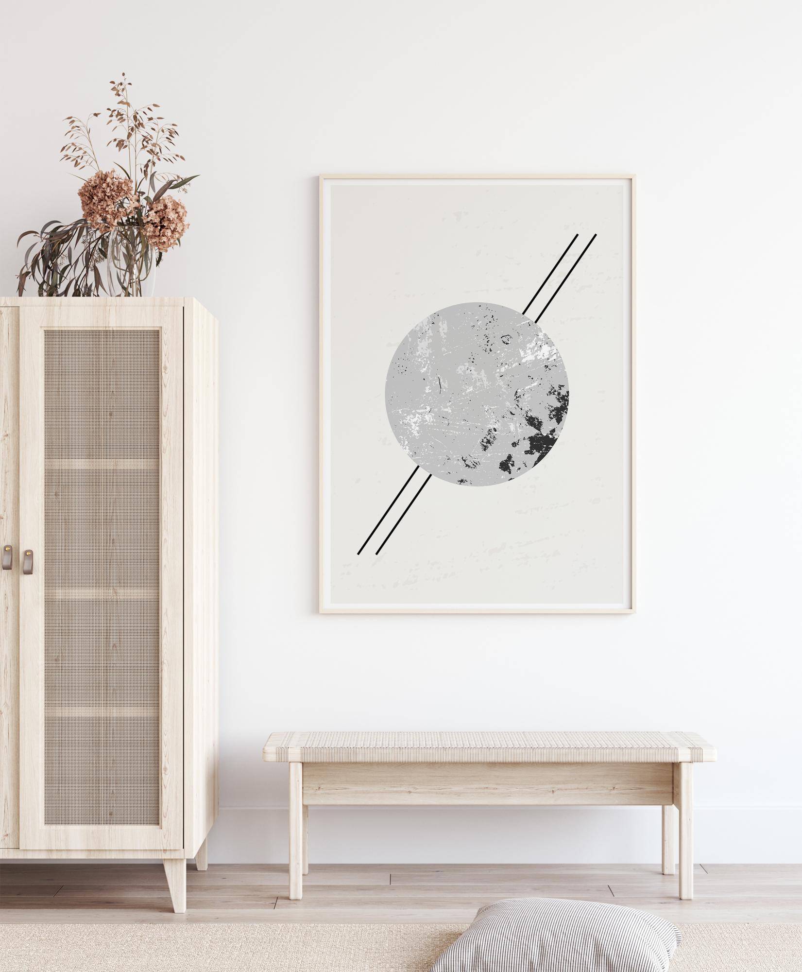 Un poster abstract cu un cerc cu două linii drepte care trec prin el. Tonurile gri moi ale cercului sunt contrastate de un efect de marmură gri închis și alb, care aproape seamănă cu pământul văzut din spațiu. Devino contemplativ când acesta este agățat pe un perete cu culori pastel moi.