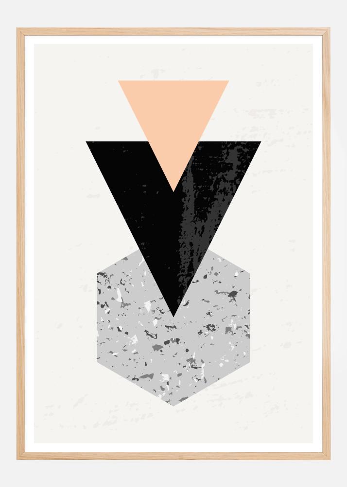 Un poster geometric triunghiular cu forme luminoase și îndrăznețe. Cele două triunghiuri în roz și negru indică în jos, ceea ce conduce ochiul către cubul mai moale albastru și punctat. Triunghiul negru plasat central menține focalizarea, făcându-l o prezentare perfectă în biroul de acasă, cu designul său mai puțin distractiv compatibil cu orice cameră.