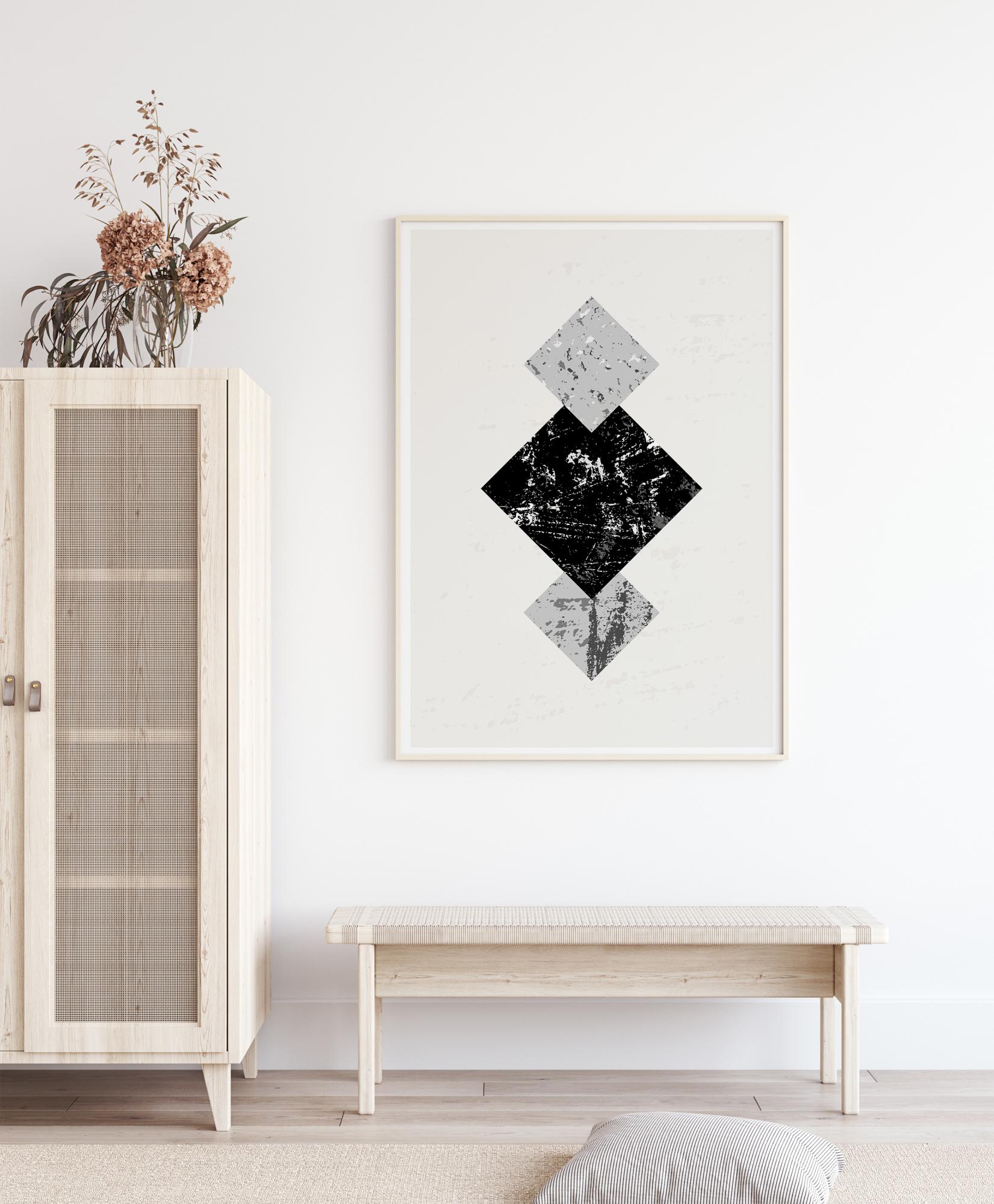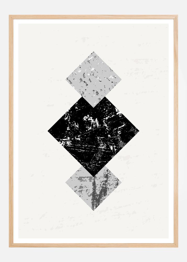 Un poster geometric cu trei pătrate care se află în centrul unui fundal alb. Pătratul mare din mijloc este negru cu efecte de marmură. Pe fiecare parte există două pătrate mai mici albastre cu efecte de marmură și pietriș. Ochiul este atras prin operă cu ajutorul punctelor din fiecare pătrat în această lucrare aproape simetrică.