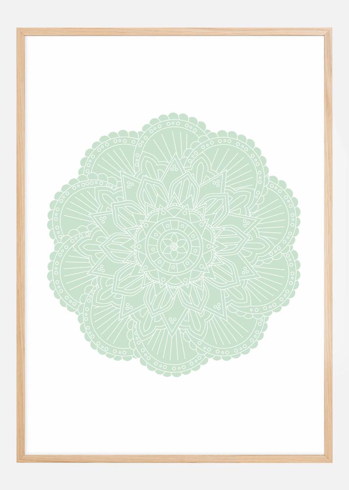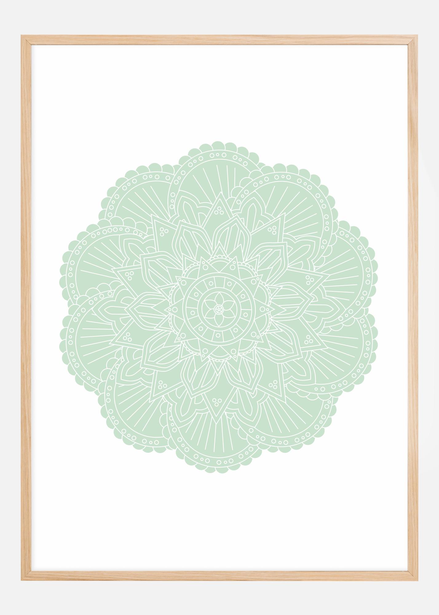 Această poster ilustrează o mandală simetrică în nuanțe relaxante de verde, o imagine care este atât vizual atrăgătoare, cât și simbolic bogată. Mandala, cunoscută pentru utilizarea sa în meditație și relaxare, oferă un model complicat care invită ochiul să exploreze și mintea să rătăcească. Tonurile moi contribuie la o senzație de echilibru și armonie, făcând această operă de artă o încadrare perfectă pentru contemplație și liniște.