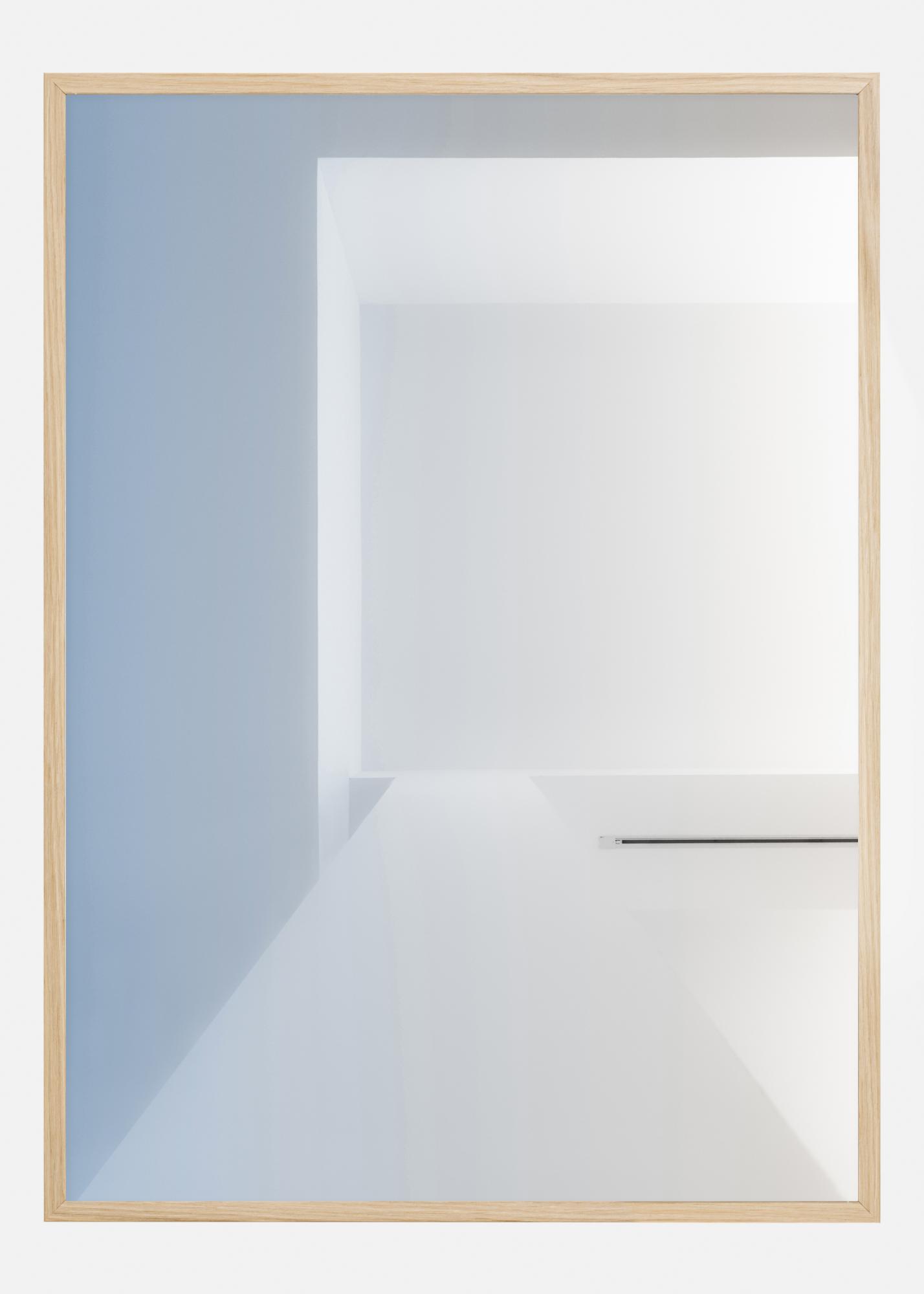 Un poster abstract pentru decorare interioară cu albastru și alb liniștitor. Fundalul principal este albastru moale cu un pătrat alb care arată ca o fereastră și un blat de masă. O explozie de alb orbitor moale în dreapta se simte ca și cum soarele pătrunde pentru un strop de liniște în casa ta.