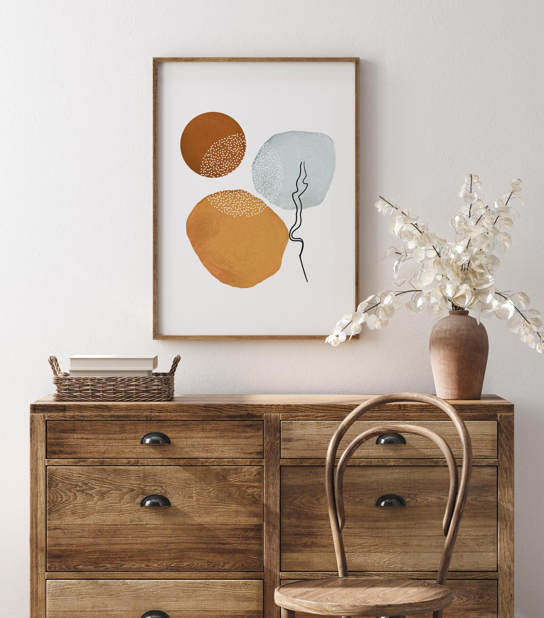 Un poster abstract simplu cu trei forme circulare principale. Peste aceste trei forme se suprapune un cerc format din mici puncte albe asemănătoare unui păpădie. Două linii simple se întrepătrund peste forma albastră și unesc lucrarea într-un întreg. Acest imprimat este un complement excelent pentru un perete de galerie sofisticat.