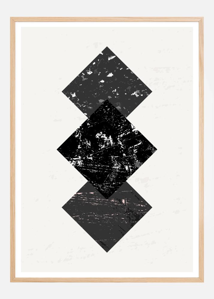 Un poster geometric cu trei pătrate întunecate care stau pe colțurile lor. Două pătrate bleumarin sunt plasate deasupra și dedesubtul unui pătrat negru mai mare. Toate sunt evidențiate cu puncte și pete albe pentru a crea un set interesant de modele. Asortează această operă de artă cu un perete albastru și lasă formele să iasă în evidență.
