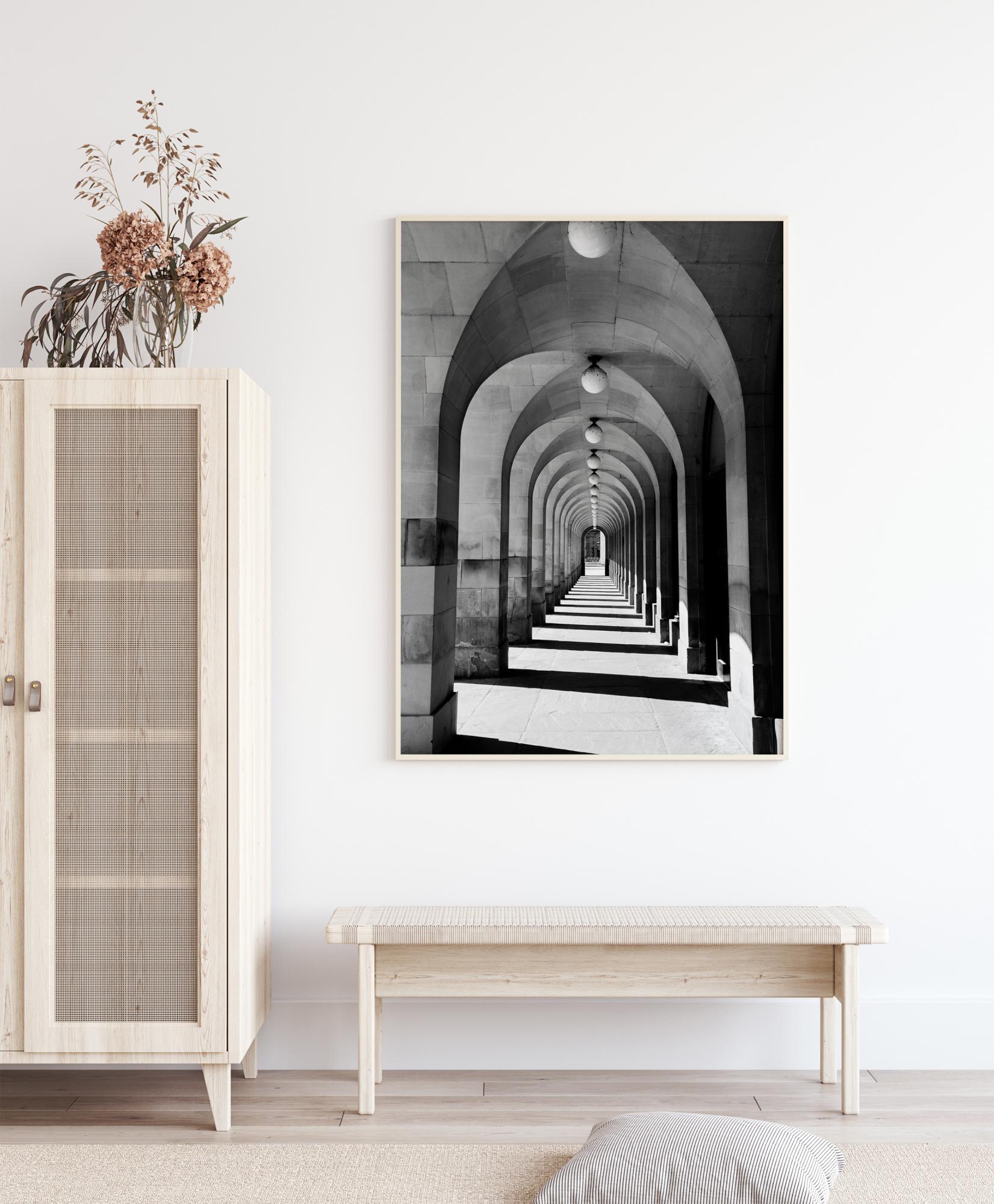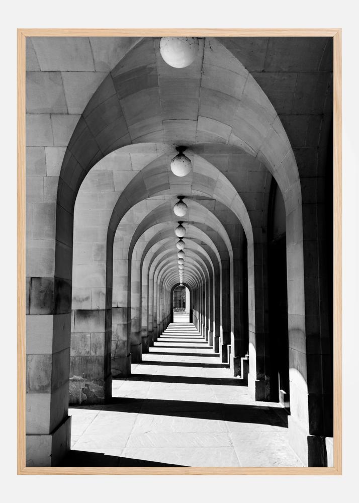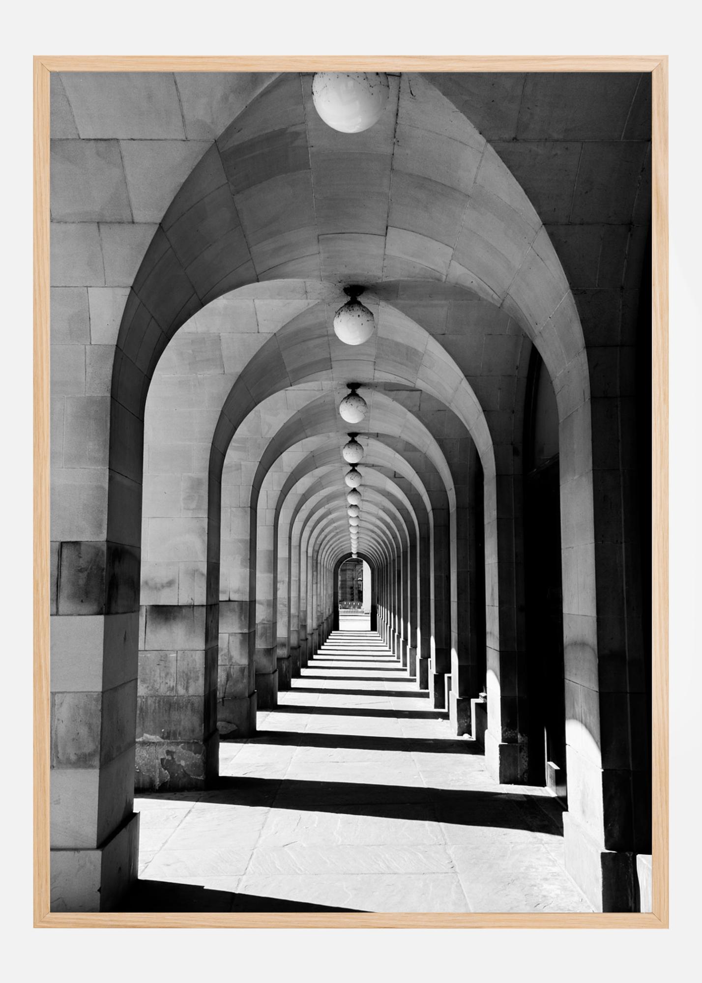Un poster de interior al unui coridor lung cu arcade. Fiecare dintre arcade îndreaptă privirea spre capătul coridorului pe măsură ce acesta dispare în depărtare. Tonurile de gri fac ca umbrele fiecărei arcade să iasă în evidență în lumină. Simte cum camera devine mai mare când agăți acest poster și urmezi coridorul cu privirea.