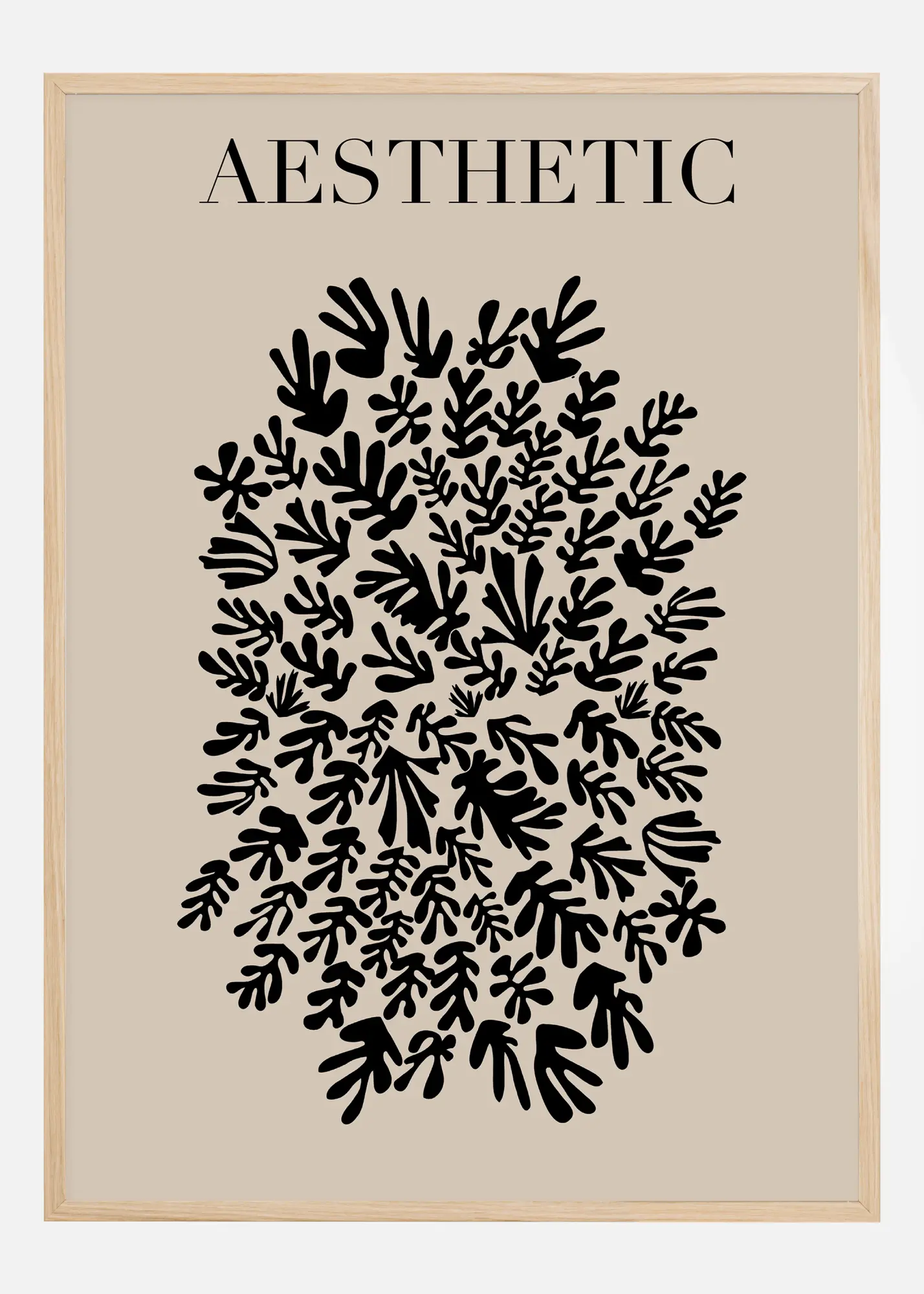 Cu expresia sa modernă și paleta de culori simplă, limitată la negru și bej, această imprimare oferă o impresie liniștitoare și echilibrată. Cuvântul "AESTHETIC" plasat în partea superioară a motivului funcționează ca o amintire puternică a frumuseții eterne a designului și naturii. Acest afiș ar fi excelent într-un decor în care se dorește crearea unei oaze de pace și inspirație, sau ca parte a unui perete mai mare de tablouri pentru a crea o experiență vizuală unificată.