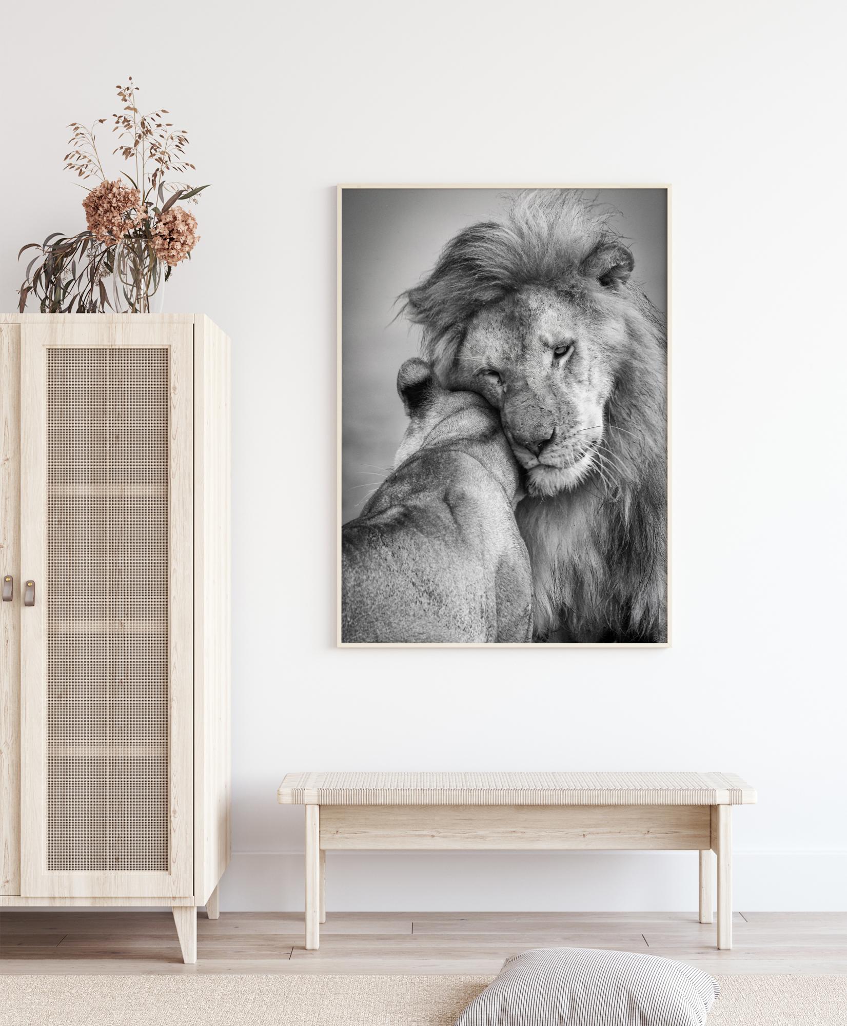 Un poster natural cu un leu și o leoaică într-un moment tandru. În această fotografie uimitoare alb-negru, vezi leul care își îmbrățișează leoaica în timp ce ea stă cu spatele la el. Experimentează iubirea din această îmbrățișare caldă când te trezești în fiecare dimineață.