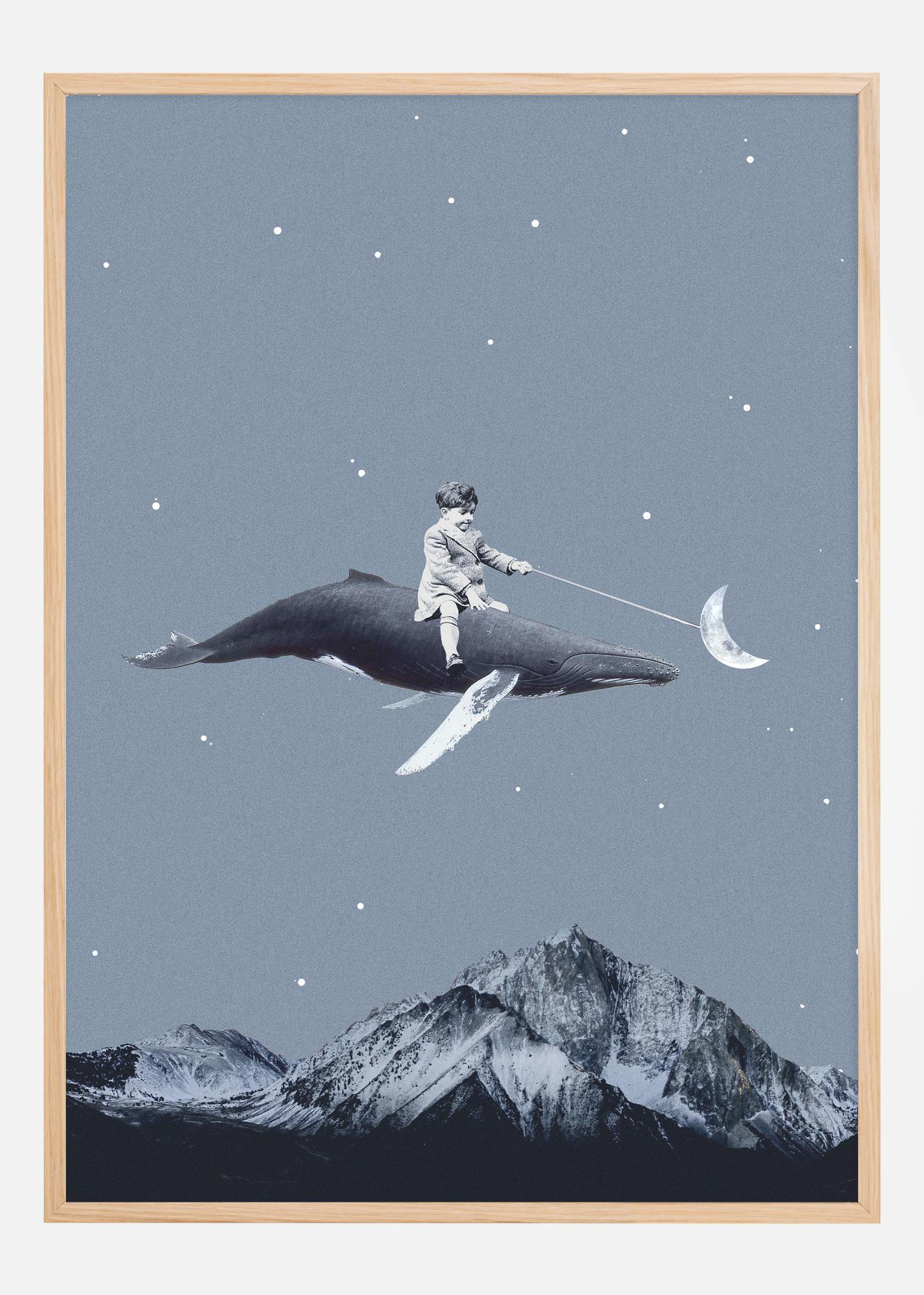 Această poster creativ și inspirator înfățișează un tânăr explorator care călărind o balenă capturează luna pe un băț. Simbolizează străduința și visul de a realiza ceea ce pare a fi imposibil. Cerurile înstelate și terenul muntos robust de dedesubt oferă un sentiment de aventură și explorare a necunoscutului vast.