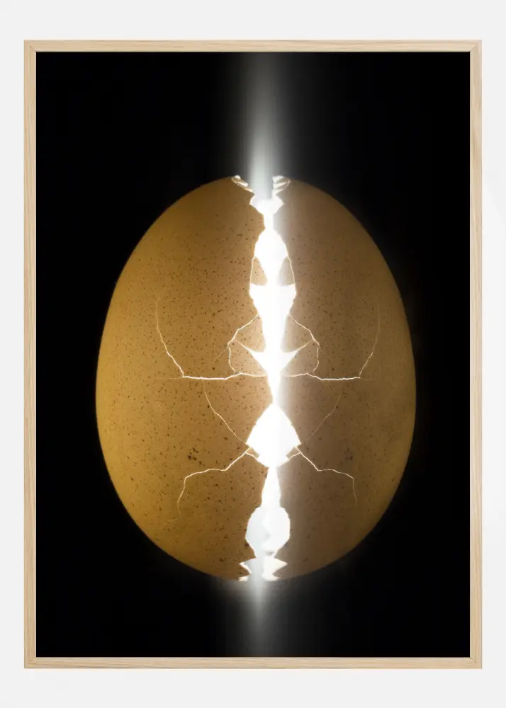 Un poster abstract dramatic cu un ou care se sparge, cu o lumină puternică care emană din el, totul pe un fundal negru. Lumina se desparte într-un model simetric superb. Razele de lumină înving întunericul într-o imagine abstractă, dar totuși convingătoare, perfectă pe oricare dintre pereții tăi.