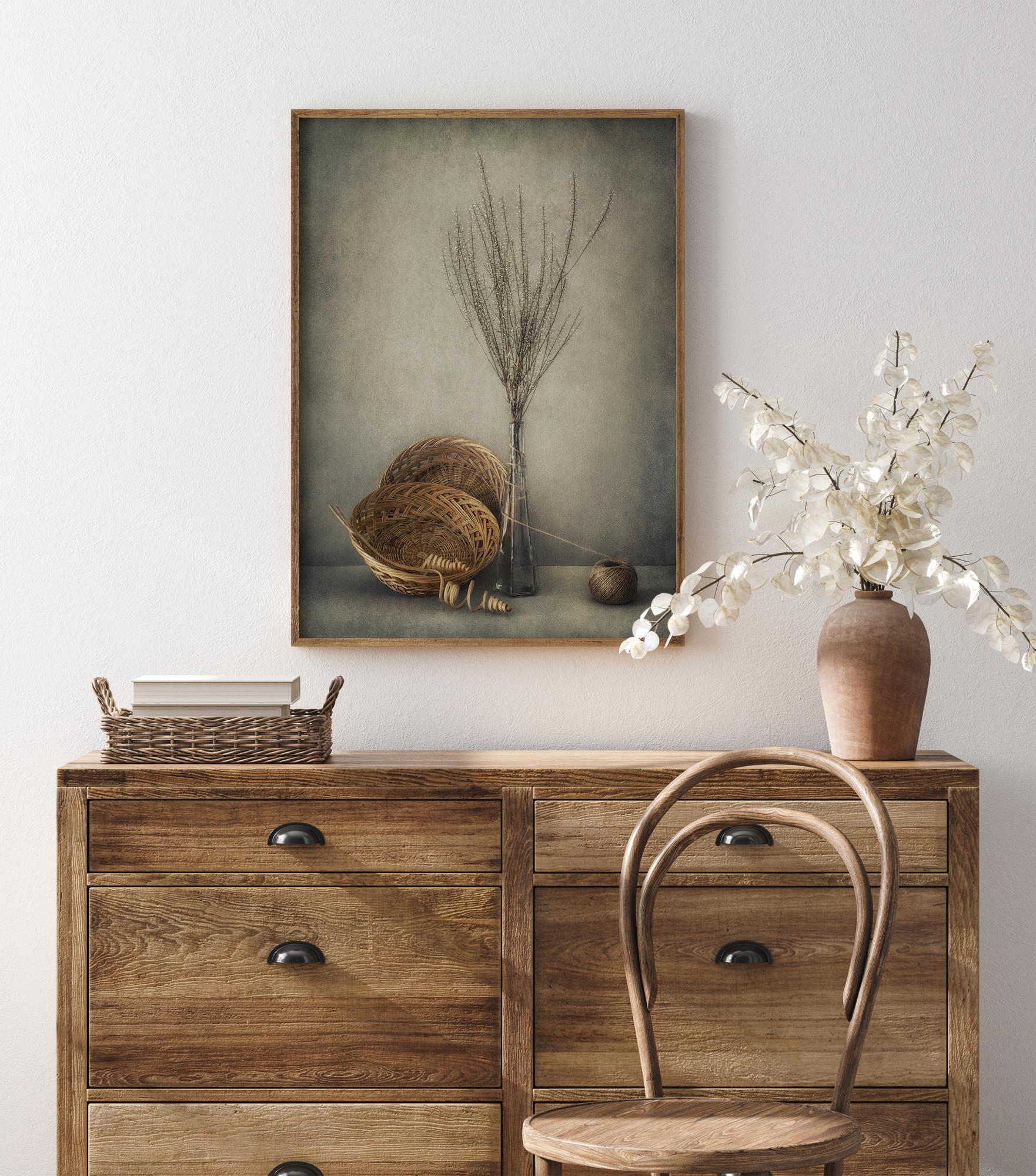 Un poster cu natură statică cu coșuri, un vas de lut și o sticlă de sticlă cu iarbă uscată. Această lucrare are tonuri subtile de sepia și gri care formează o lucrare moale și armonioasă. Aduceți puțină liniște în casă cu acest poster și combinați-l cu un perete neutru, astfel încât să nu iasă prea mult în evidență.