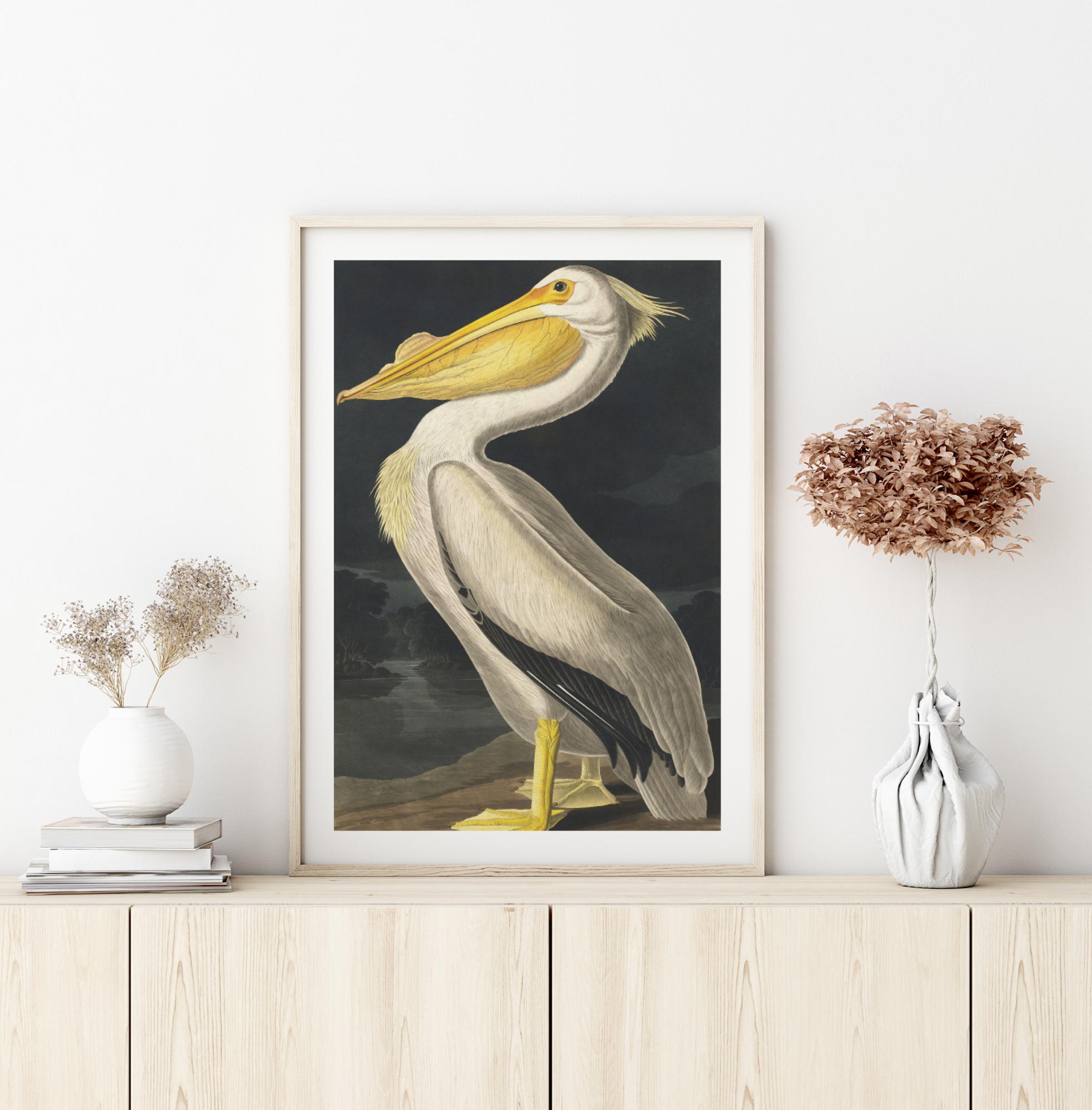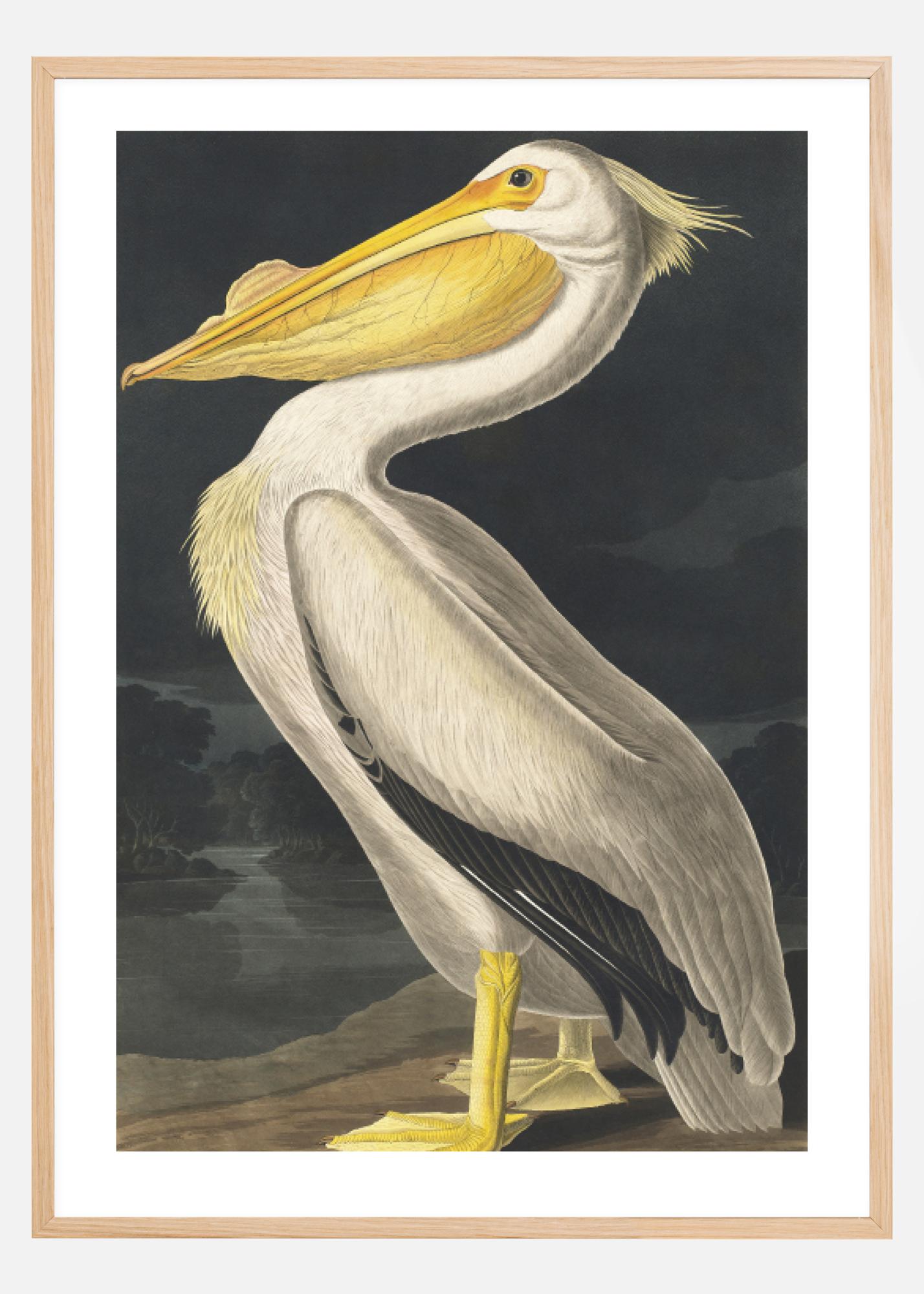Un poster natural cu un pelican pictat. Aici pasărea stă sus și mândră, cu ciocul robust galben spre piept. Labele galbene marcate și pieptul alb contrastează puternic cu peisajul întunecat și estompat din spate. Adu cu tine o senzație de picturi antice cumpărând această imagine fantastică.