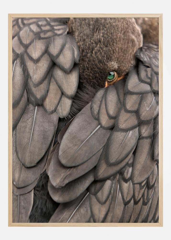 Această poster captivant surprinde momentul de intimitate în natură prin prim-planul unei păsări, unde ochiul său verde strălucitor strălucește ca un smarald încrustat printre nuanțele de gri ale penajului. Fiecare pană este sculptată cu precizie, evocând un sentiment al formei și structurii elegante a păsării. Este o operă care vorbește atât iubitorilor de păsări, cât și artiștilor, și celor care apreciază frumusețea subtilă a naturii.