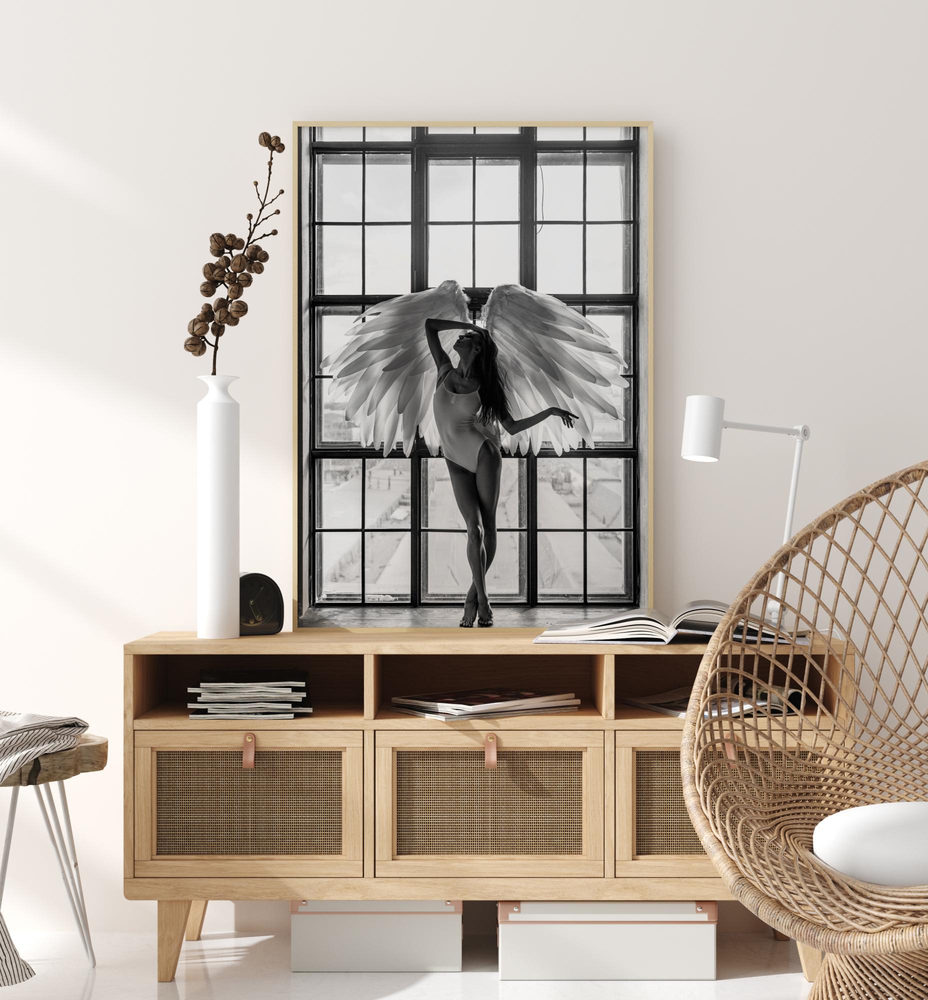 Un poster artistic frumos în tonuri de gri închis al unei femei care pozează într-o fereastră mare, purtând un body și aripi mari de înger frumoase. Un poster ușor de combinat cu alte favourite, dar care se potrivește la fel de bine ca o piesă singulară atrăgătoare.