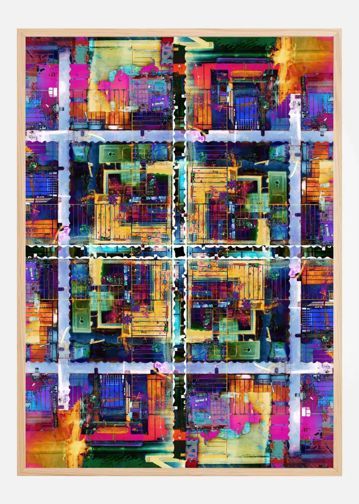 Un poster neon plin de modele abstracte. Ca un spectru de culori asemănător unui pete de ulei, această imagine seamănă cu o secțiune transversală a diferitelor încăperi. Fiecare pătrat este umplut cu o multitudine de culori, ceea ce face ca aceasta să fie o operă fascinantă pe care o poți privi ore în șir - cel mai bine se potrivește dacă o așezi pe un perete neutru.