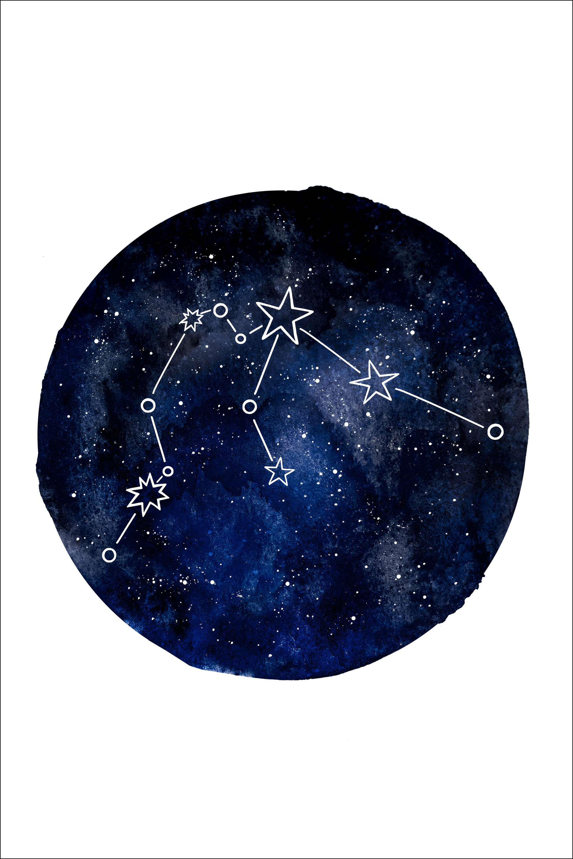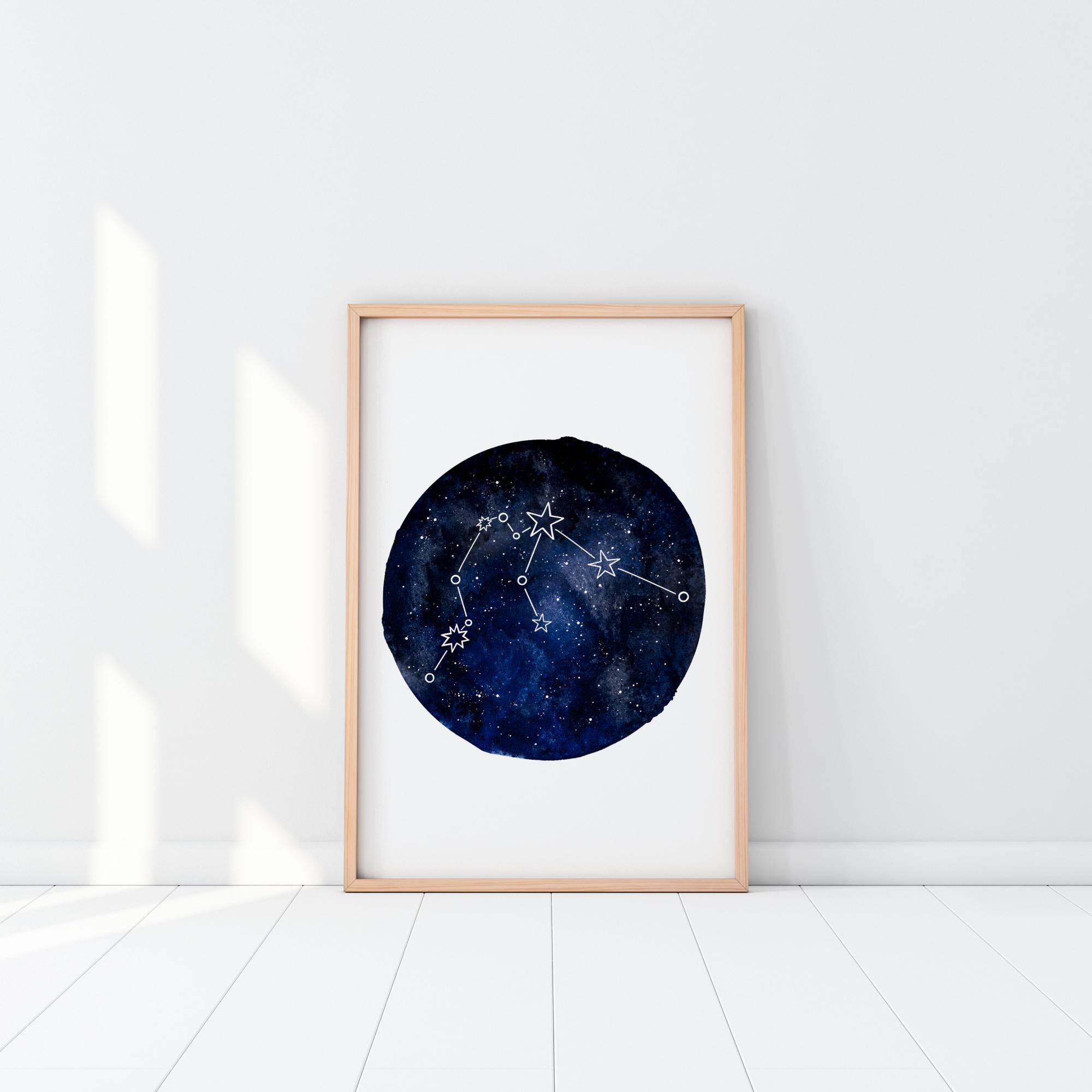 Un poster abstract cu semnul zodiacal Vărsător. Un glob albastru închis atârnat cu o imagine a galaxiei care evidențiază semnul zodiacului. Globul se află pe un fundal simplu alb. Atârnați-l pe orice perete acasă pentru a putea vedea semnul zodiacal pe cerul nopții.