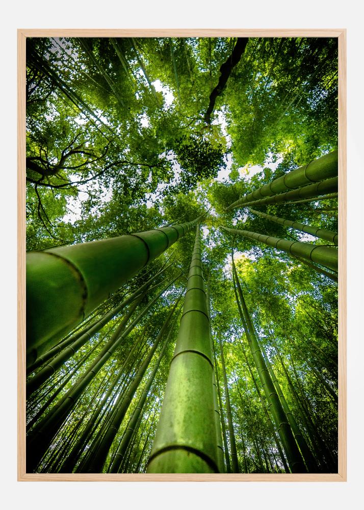 Un poster cu natură cu plante de bambus verzi. Privește spre cer când această imagine este înconjurată de tulpini groase de bambus care duc la un acoperiș verde de frunziș sus în cer. Imaginează-ți că stai întins în această lume liniștită a junglei când aduci această imagine în casa ta.