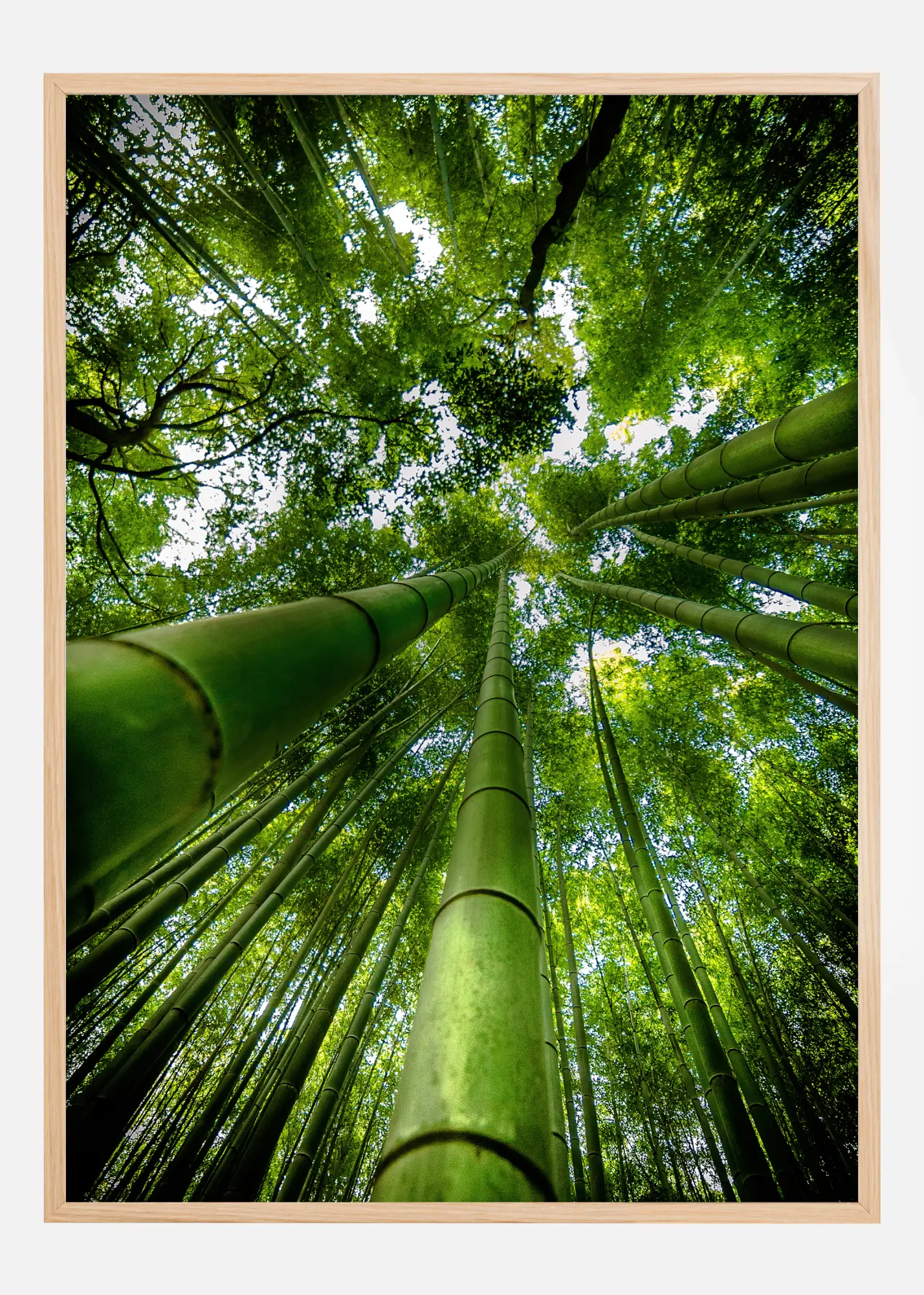 Un poster cu plante verzi de bambus. Privește spre cer când această imagine este înconjurată de tije groase de bambus ce duc spre un acoperiș verde de frunziș sus în cer. Imaginează-ți că te afli întins în această lume liniștită de junglă când aduci această imagine în casa ta.