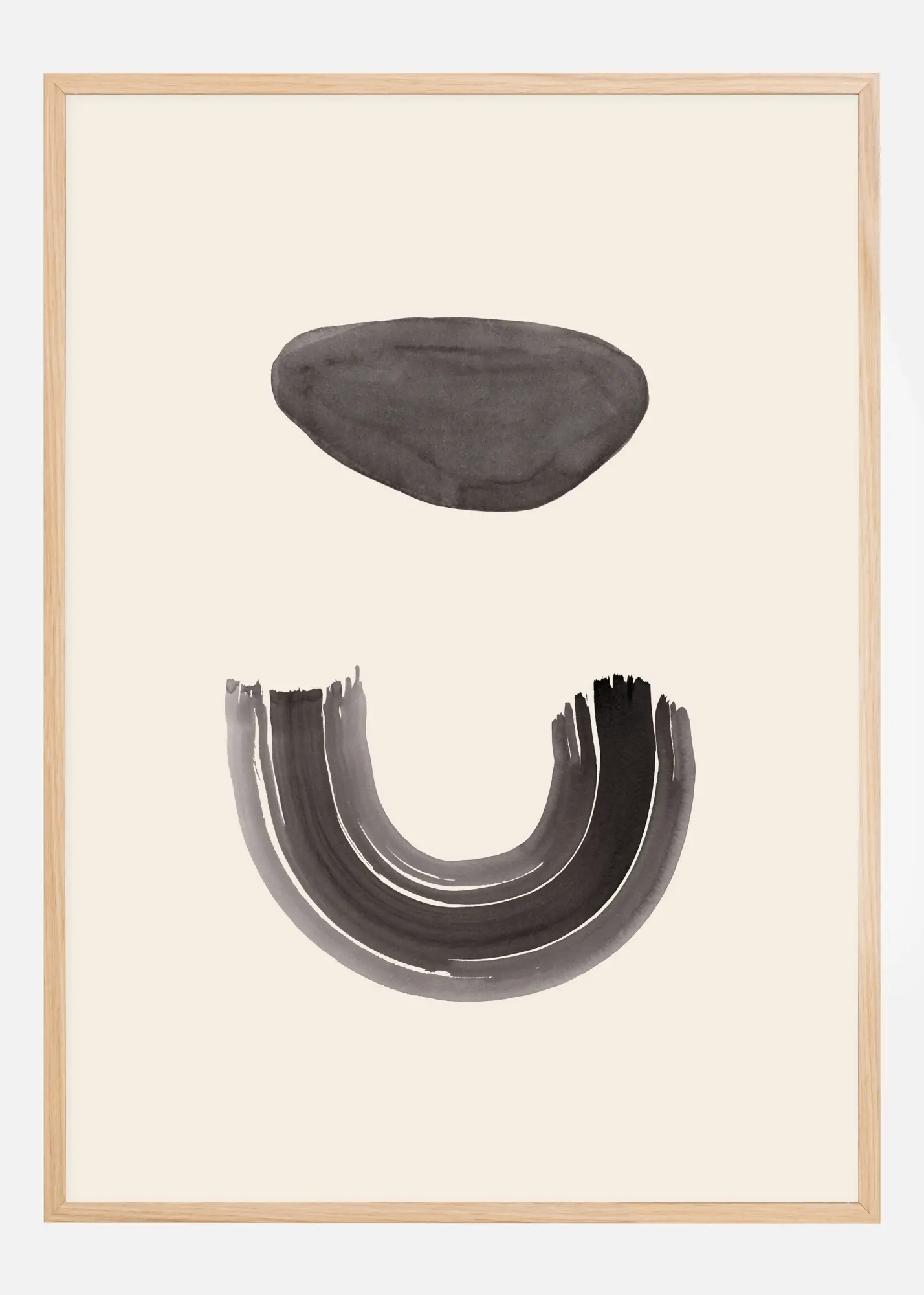 Un poster abstract elegant cu un arc și o piatră. Piatra este suspendată în mijlocul unui fundal alb, arcul răsturnat chiar dedesubt face să pară un chip zâmbitor. Este un magnet sub piatră? Încurajați interpretări libere atunci când ați pus această lucrare acasă.