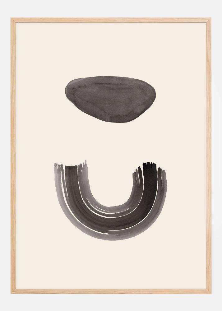 Un poster elegant abstract cu un arc și o piatră. Piatra este suspendată în mijlocul unui fundal alb, arcul cu susul în jos chiar dedesubt face să pară un chip zâmbitor. Este un magnet sub piatră? Încurajează interpretările libere atunci când ai pus această operă acasă.