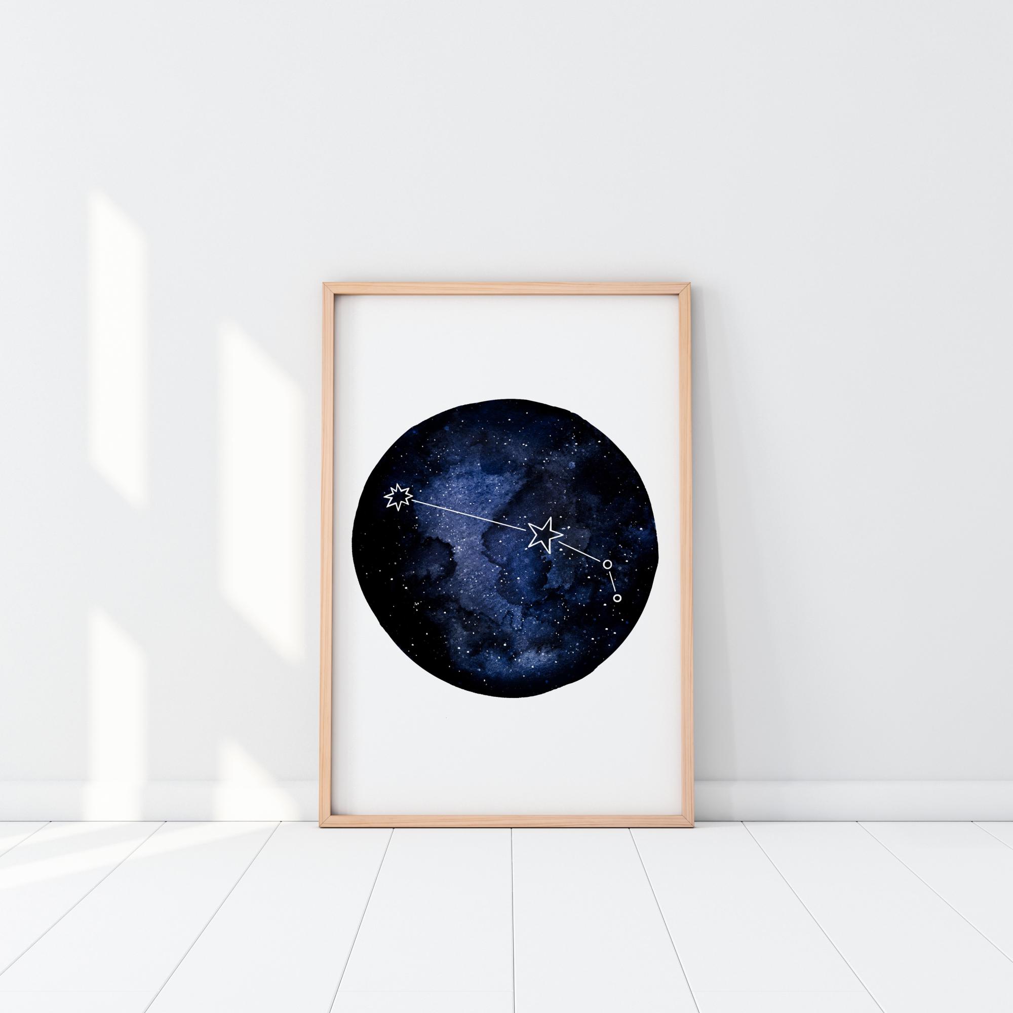 Un poster abstract al zodiei Berbec. Un glob suspendat albastru închis cu o imagine a galaxiei și o conturare a zodiei. Globul este pe un fond alb obișnuit. Agățați-l pe un perete în casa voastră și vedeți dacă puteți descoperi acest semn zodiacal pe cerul de noapte.