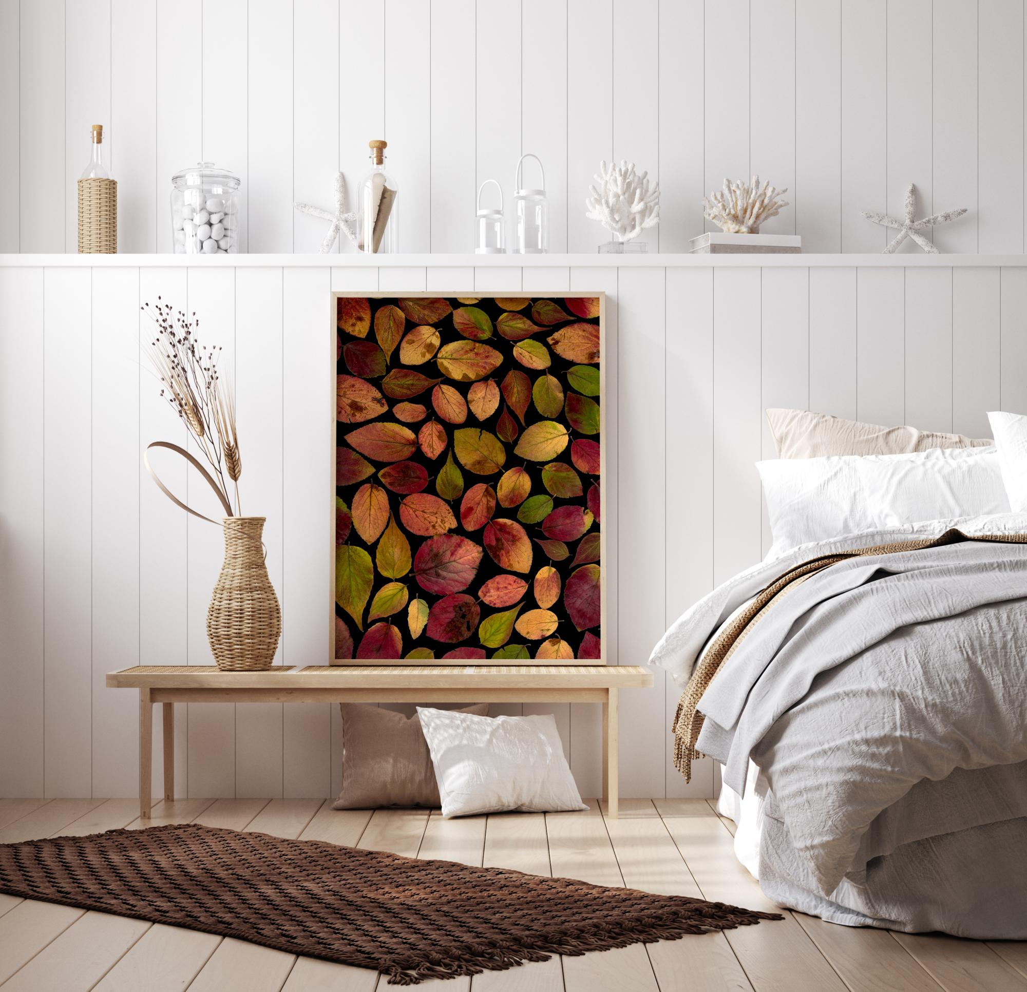 Un poster cu model de frunze de toamnă. Un rând de culori galbene, roz și roșii întâlnesc ochiul în această colecție organizată de frunze. Toate frunzele se îmbină pe un fundal întunecat, aducând vivacitatea toamnei acestui poster. O pată perfectă de culoare în bucătărie sau hol.
