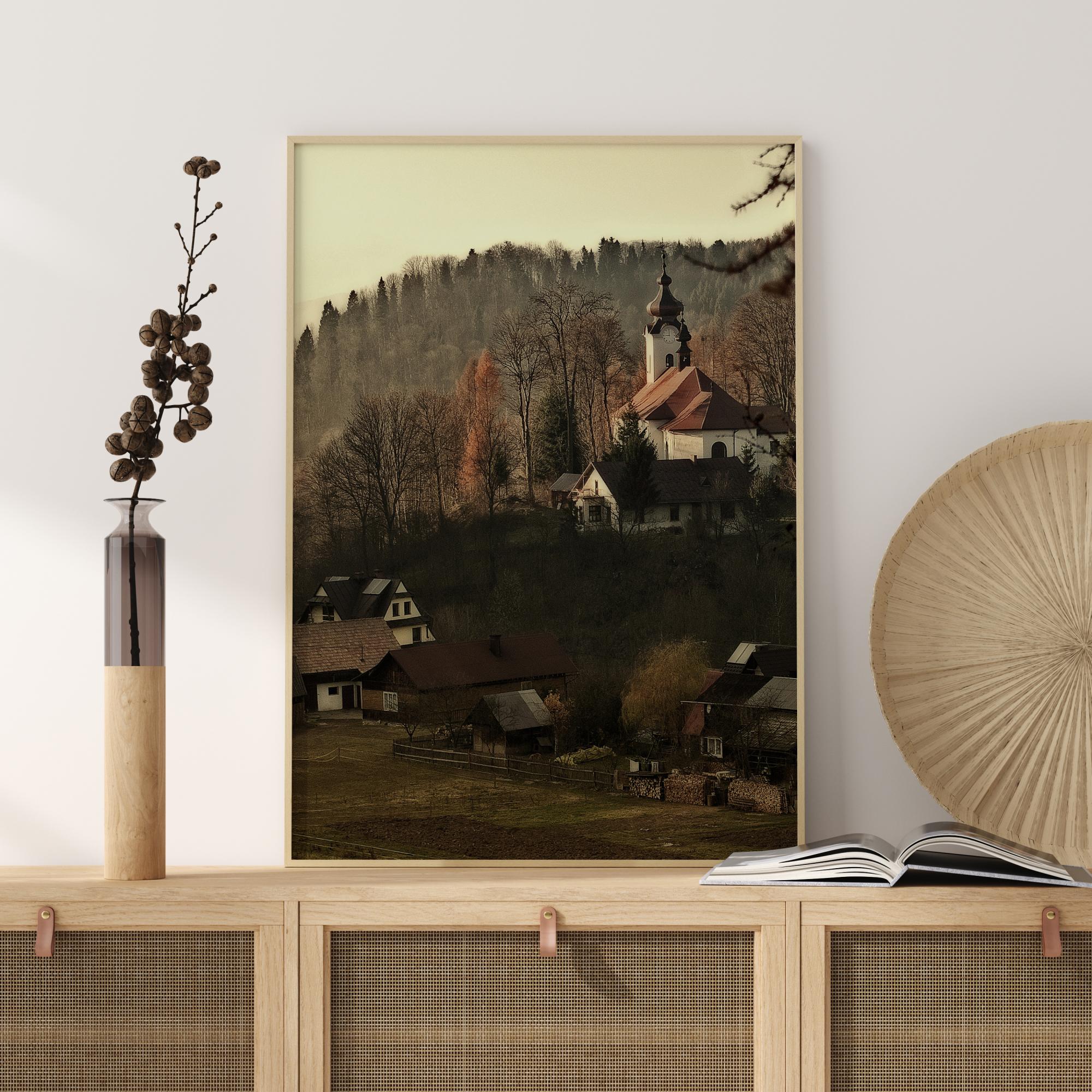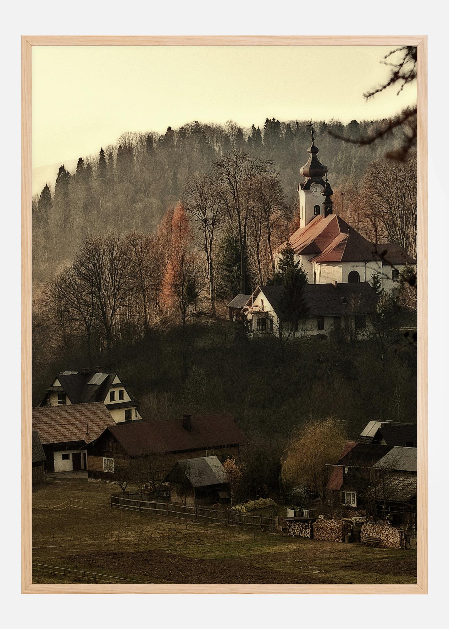 Un poster urban cu o mică localitate din mediul rural, cu case vechi și câmpuri cu dealuri acoperite de copaci în spate. Un turn de biserică alb se înalță față de peisajul în culori temperate de maro și verde. Cufundă-te pe tine și imaginația ta cu ajutorul acestui sat pitoresc atunci când agăți posterul pe perete.