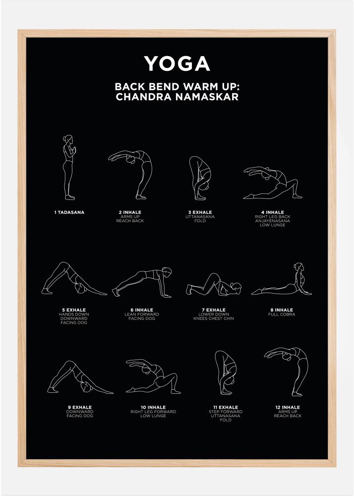 Posterul este elegant cu un design simplificat, dar funcționează și ca un ajutor de nădejde atunci când dorești să înveți unul dintre exercițiile clasice de încălzire ale yoga „Chandra Namaskar”. Posterul este disponibil în negru sau alb și într-o varietate de dimensiuni.