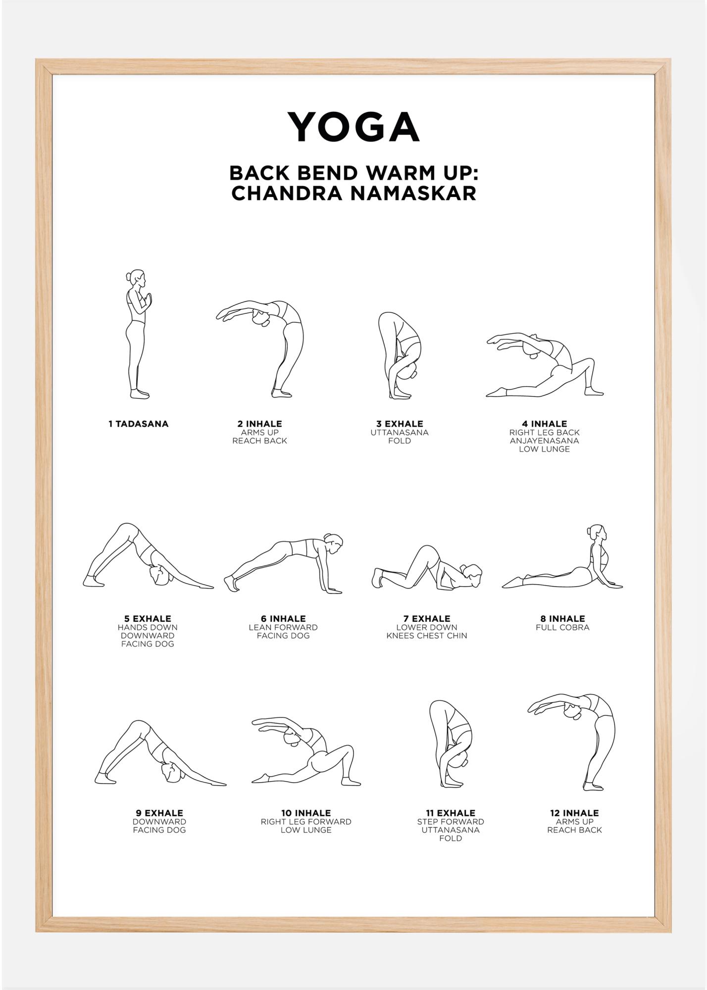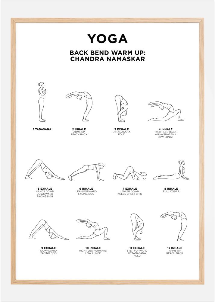 Afișul este elegant, având un design simplu, dar funcționează și ca un ajutor atunci când dorești să înveți unul dintre exercițiile clasice de încălzire yoga ”Chandra Namaskar”. Afișul este disponibil în negru sau alb și într-o gamă variată de dimensiuni.