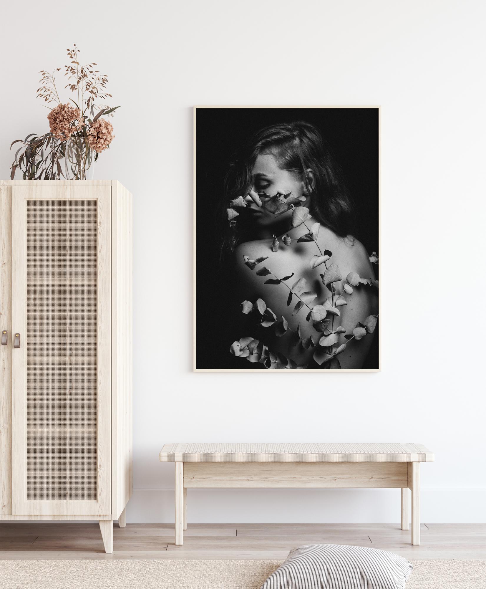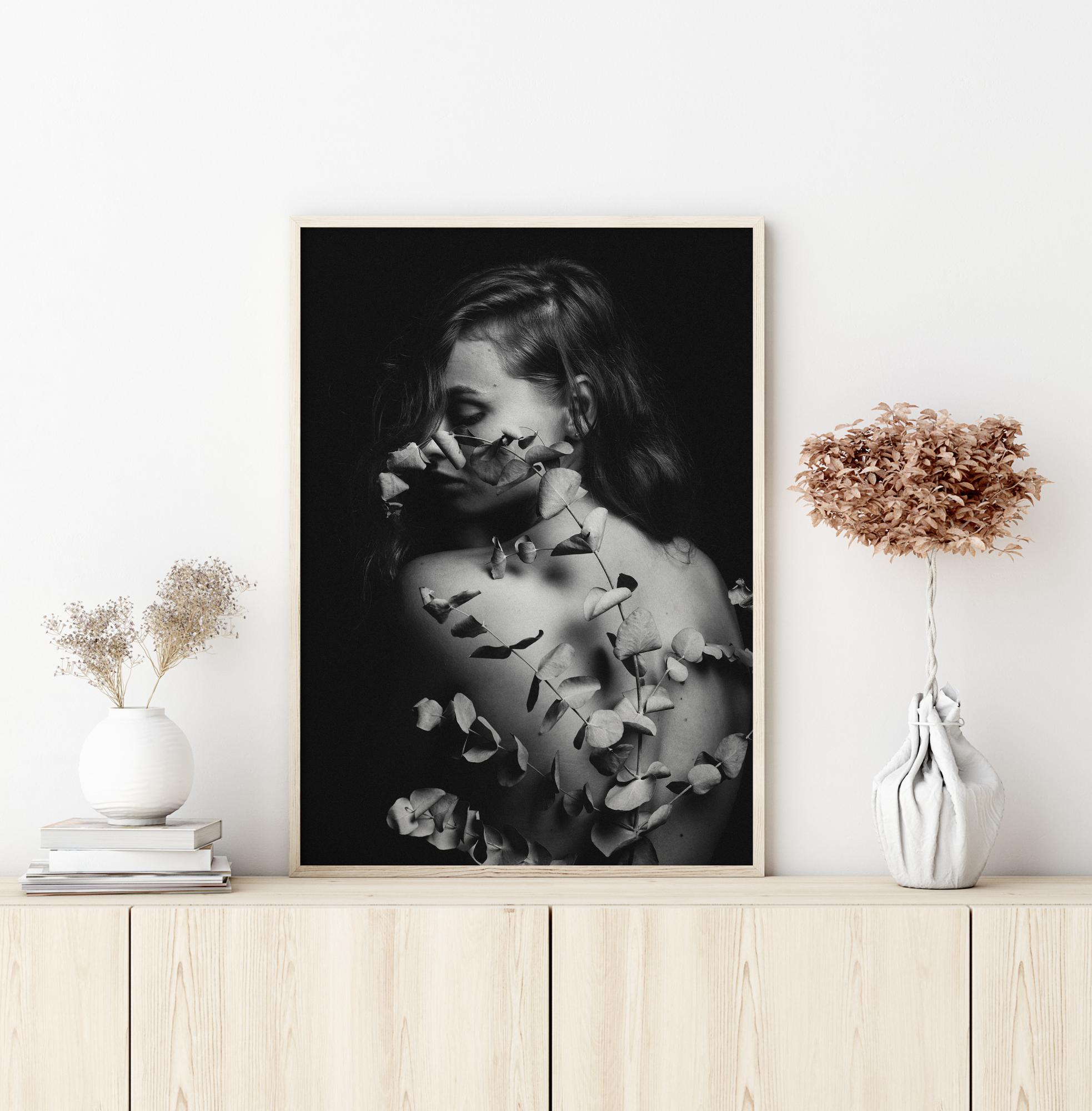 Un poster frumos cu o femeie cu frunze pe spate. Combină această imagine alb-negru cu o culoare de perete vie pentru a obține un efect dramatic. Simte misterul și pacea și adu-le cu tine acasă.