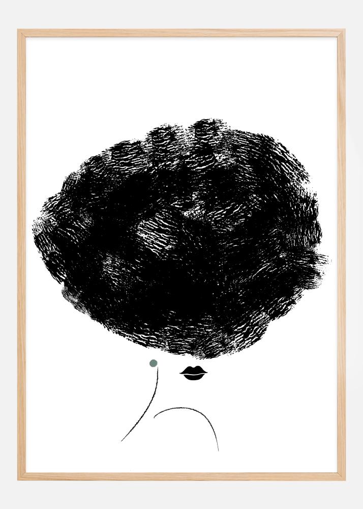 Această afișă conceptuală înfățișează un profil feminin minimalist dar expresiv, în care părul ei mare și voluminos domină scena. Părul, reprezentat cu tușe de pensulă puternice și groase de negru, creează un contrast dramatic cu fundalul alb și oferă senzația unei mișcări dinamice capturate într-un moment de liniște. Un punct mic, discret, de verde, plasat lângă ureche, rupe monotonia și adaugă un accent subtil de culoare. Această imprimare subliniază esențialul în formă și culoare, oferind o estetică îndrăzneață și modernă oricărui spațiu contemporan.
