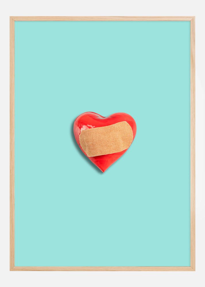 Această poster inspirațională arată o inimă roșie cu un plasture pe ea, pe un fundal liniștitor turcoaz. Simbolismul este puternic și deschis interpretării, fie că este vorba de vindecarea unei inimi frânte sau de îngrijirea rănilor noastre emoționale. Contrastul viu dintre inima roșie și fundalul liniștitor oferă imaginii o rezonanță profundă și emoțională.