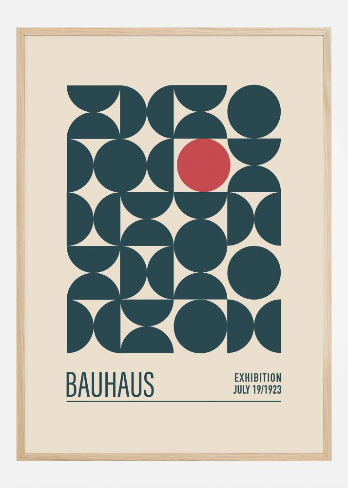 Această poster captează esența minimalistă a mișcării Bauhaus și accentul său pe geometrie și culoare. Compoziția grafică constă din cercuri suprapuse în diferite nuanțe de albastru cu un cerc roșu accentuat, care creează o experiență vizuală dinamică și totuși echilibrată. Textul "EXPOZIȚIE BAUHAUS 19 IULIE/1923" face aluzie la expozițiile istorice ale școlii de design care au fost inovatoare pentru designul modern.