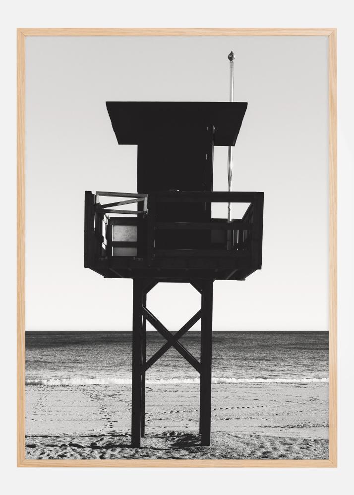 Această posteră monocromă prezintă o siluetă iconică a unui turn de salvamar pe fundalul unui cer senin și a unei mări liniștite. Contrastul puternic între turnul de salvamar întunecat și tonurile deschise de nisip și cer conferă imaginii o calitate grafică ce este atât izbitoare cât și contemporană. Imaginea, care este surprinsă la nivelul ochilor, creează un sentiment de prezență și calm, ca și cum ai sta direct pe plajă și ai privi la marea vastă.