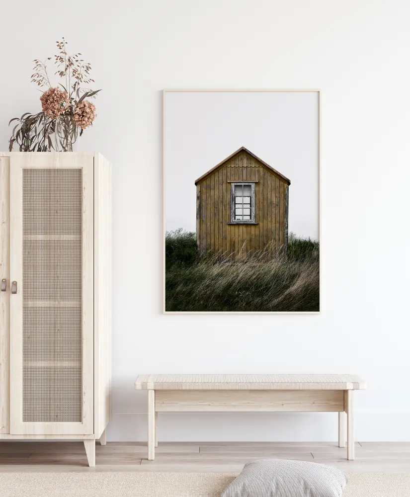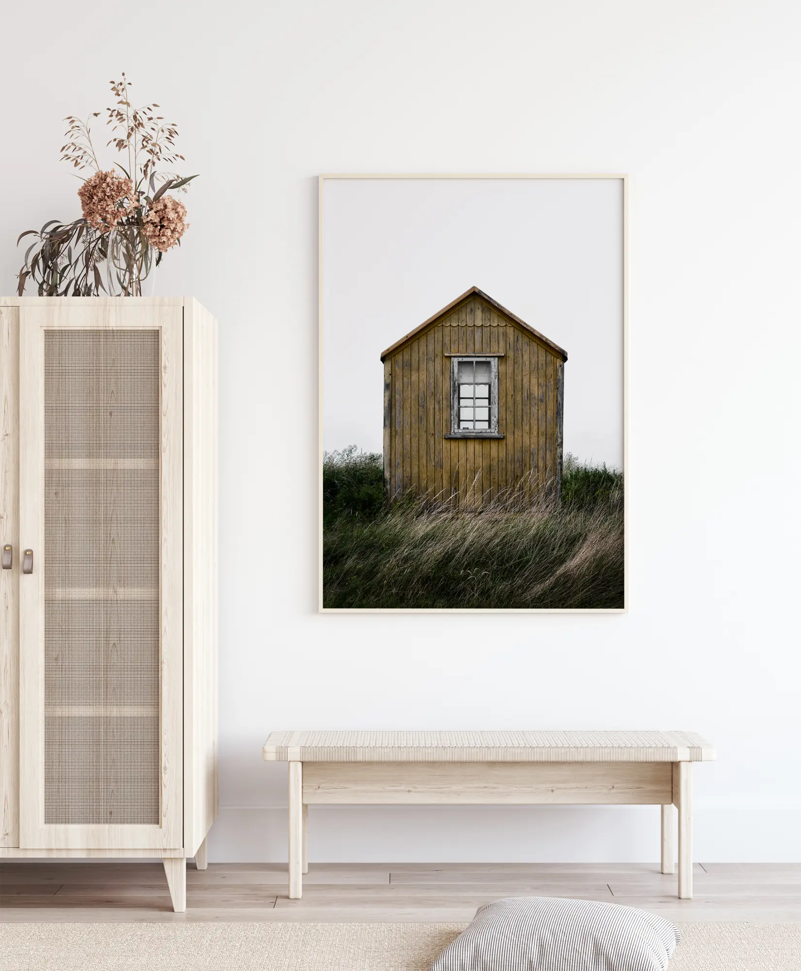 Un poster de peisaj elegant cu o cabană simplă de lemn pe plajă. Căsuța solitară se află pe dune de nisip bătute de vânt și iarbă. Simți deschiderea și libertatea când o pui în casa ta.