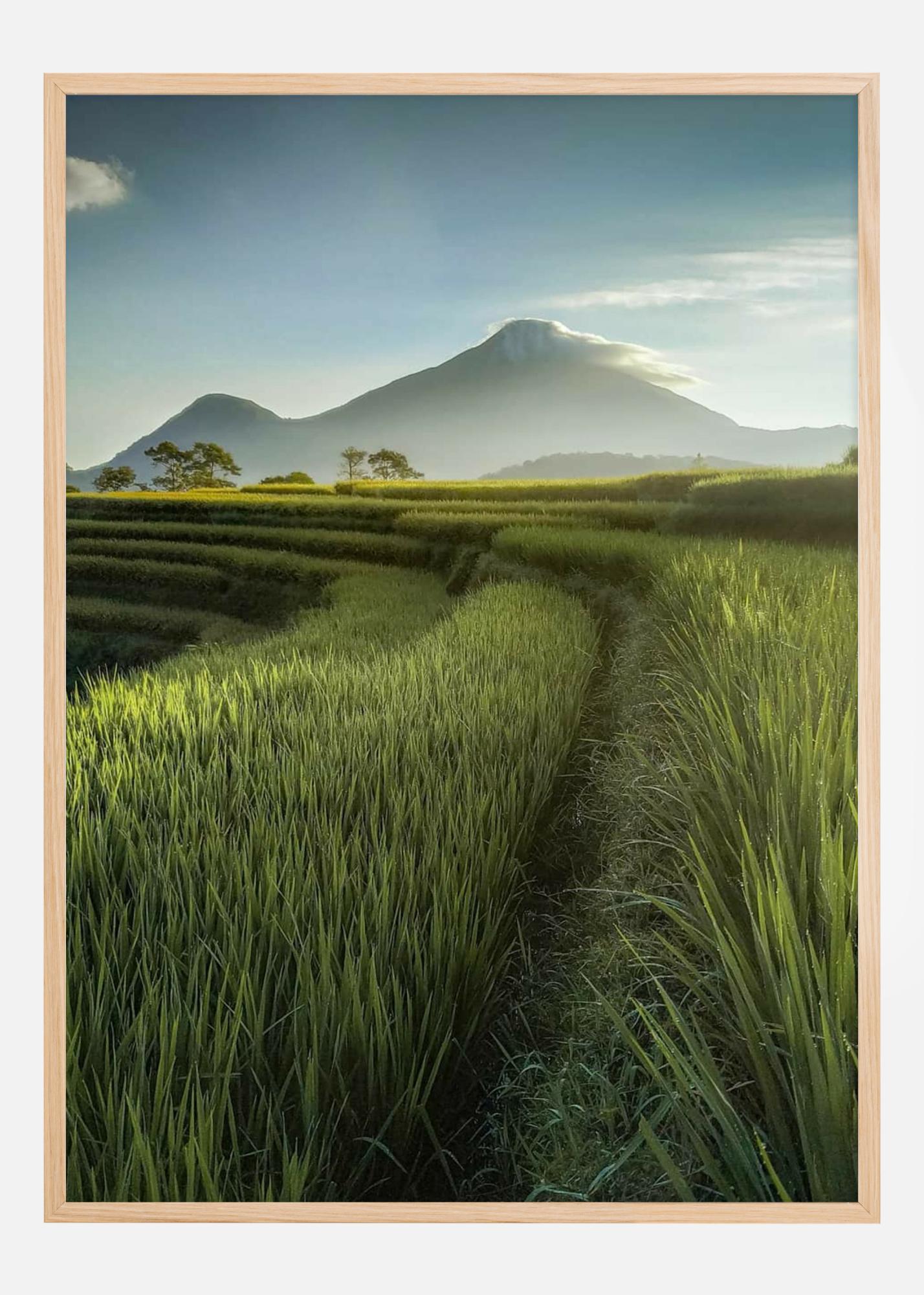 Această poster oferă o privire asupra unei idile pastorale, unde câmpuri de orez verzi se întind pe un fundal de munți măreți și un cer blând. Lumina care se revarsă peste peisaj oferă o senzație caldă și primitoare, făcând această imprimare o modalitate perfectă de a aduce o bucățică din liniștea și frumusețea naturii în casa sau locul dumneavoastră de muncă.