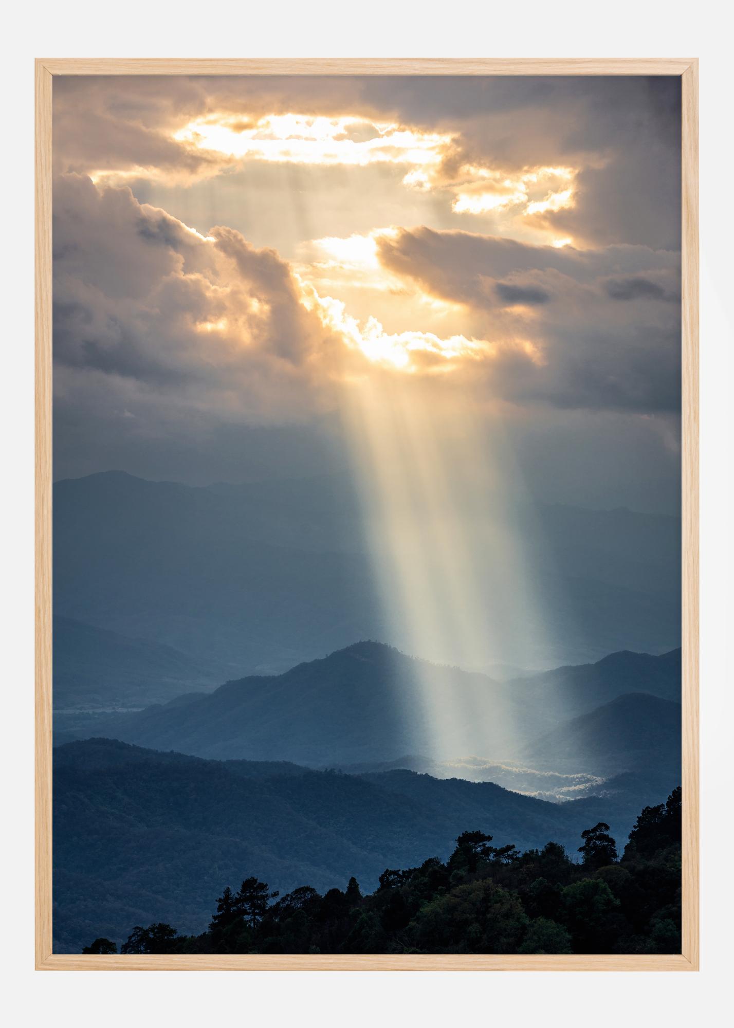 Această poster inspirator înfățișează un peisaj măreț unde razele soarelui pătrund prin nori și luminează munții ondulați. Este o scenă care capturează frumusețea sublimă a naturii, cu un cer dramatic care contrastează cu munții conturați delicat. Umbrele și lumina joacă peste peisaj, creând o puternică senzație de adâncime și spațiu.