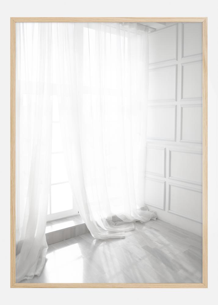 Această poster liniștită și purificatoare ilustrează un colț liniștit al unei camere drapată cu perdele albe transparente. Lumina care se filtrează prin țesătură creează un joc de umbre și nuanțe pe podeaua lucioasă, oferind o senzație de liniște și claritate. Acest print minimalist este o expresie a liniștii și s-ar potrivi perfect într-un mediu care aspiră la simplitate și calm.