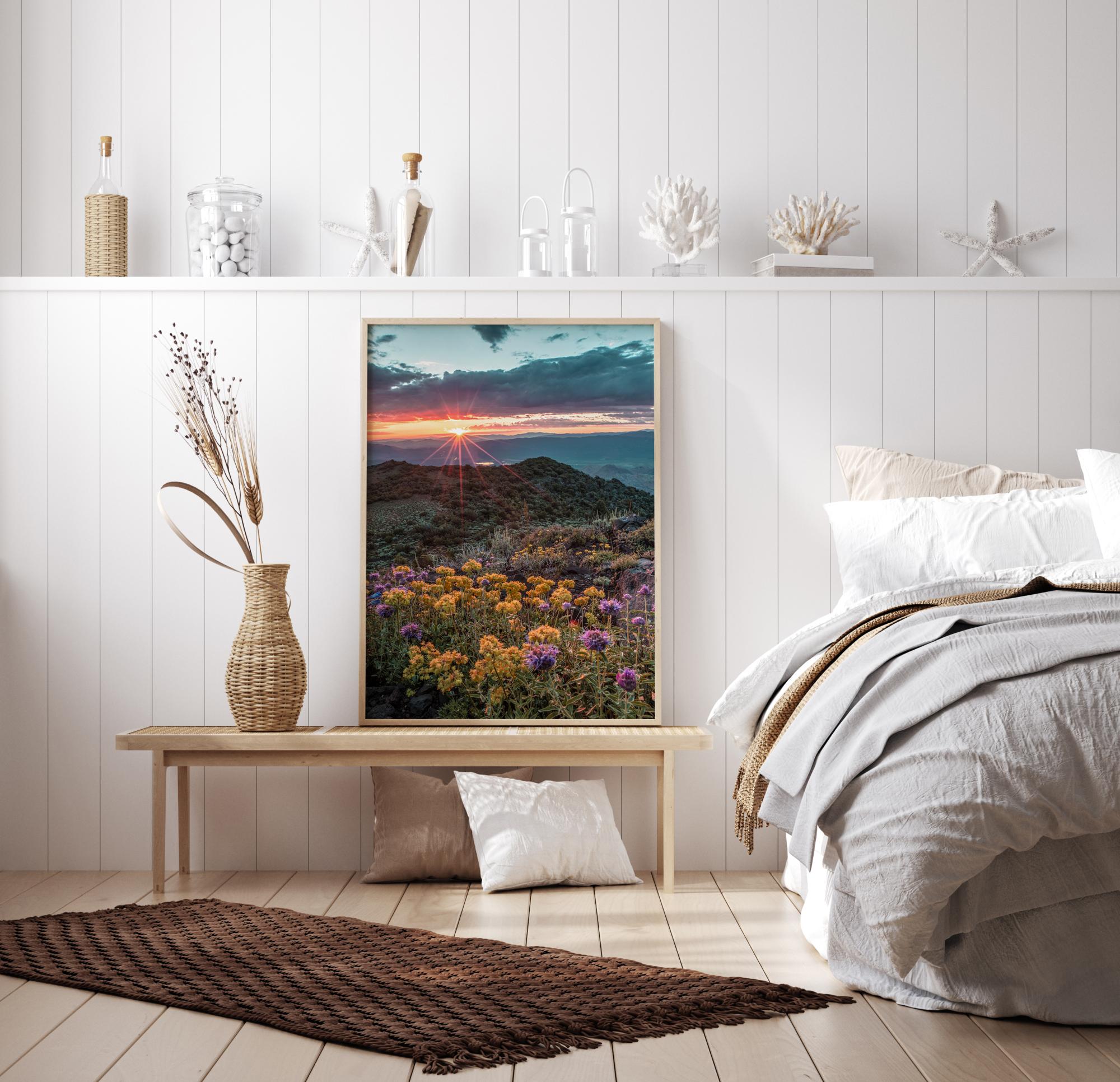 Un poster natural cu flori sălbatice pe un versant de munte în fața unui apus de soare fantastic. Florile frumoase galbene și mov umplu imaginea, conducând privirea către vârfurile munților și cerul în amurg. Apusul de soare apare ca o stea roșie, oferind un punct focal pronunțat. Agățați această operă pe peretele dumneavoastră pentru a experimenta o parte din natură acasă.