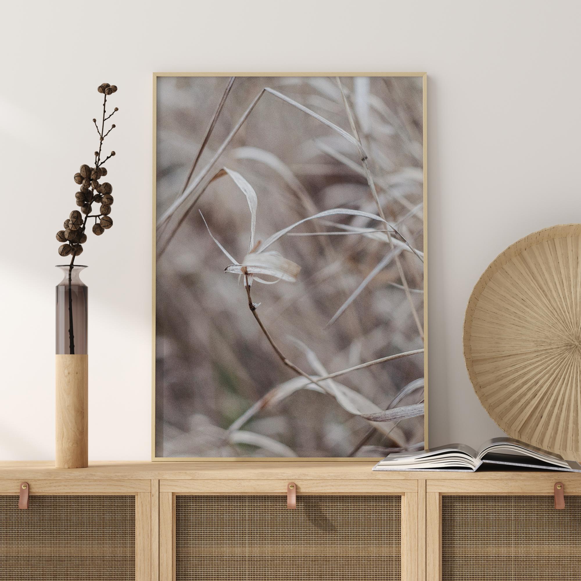 Un poster natural elegant cu frunze moi în prim-plan. Tulpinile și frunzele moi conduc privirea în jurul operei. O senzație de adâncime apare datorită faptului că fundalul este defocalizat. Așează această imagine pe un perete de culoare deschisă pentru ca nuanțele moi neutre pastelate să iasă în evidență.