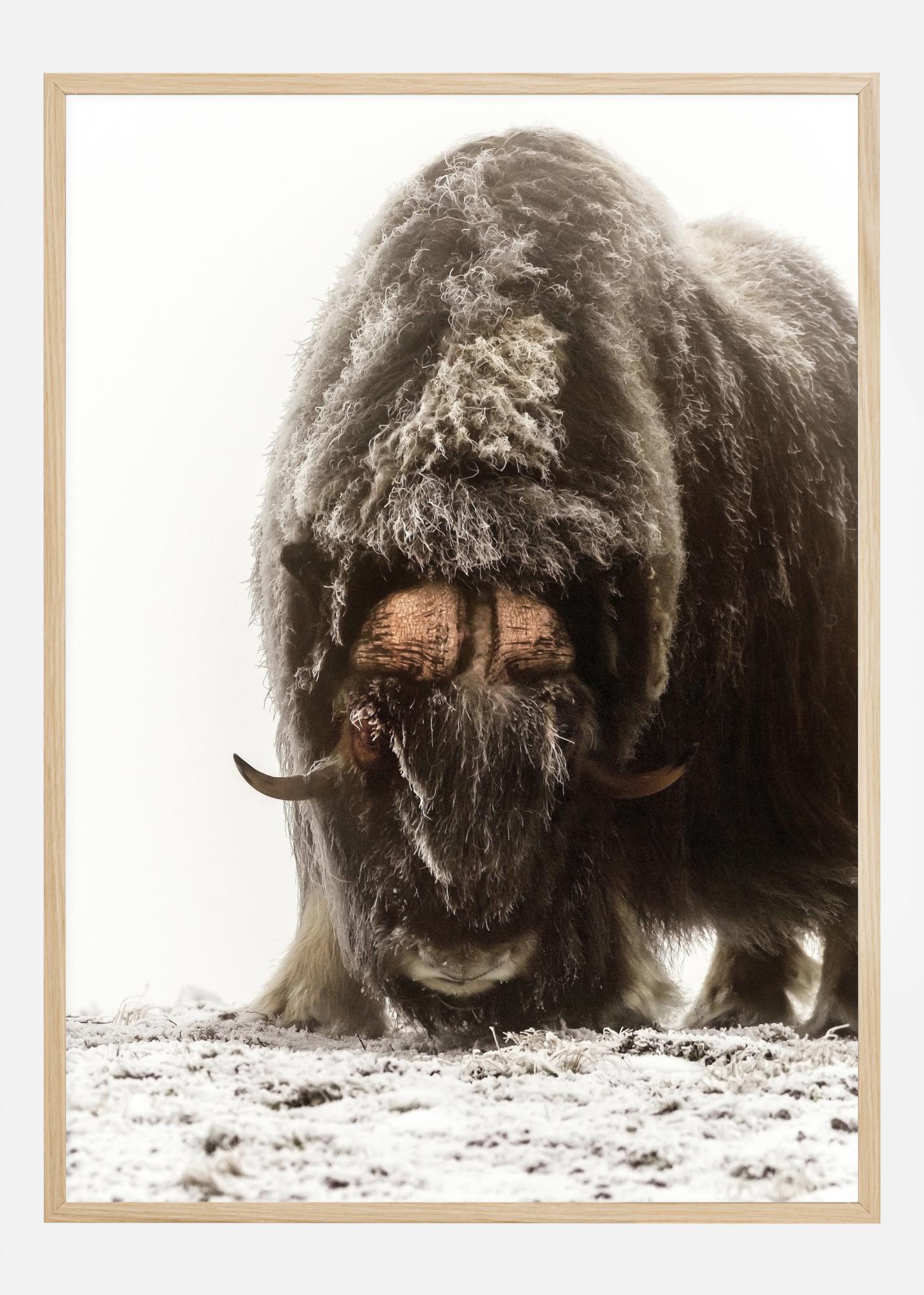 Un poster de sălbăticie cu un yak acoperit de zăpadă. Blana lungă și maro a yakului pare moale și luxuriantă în timp ce stă orientat spre cameră și caută hrană. Fundalul alb de zăpadă îl face să iasă în evidență și adaugă puțină dramatism imaginii. Agață-l pe peretele tău pentru o senzație de iarnă.