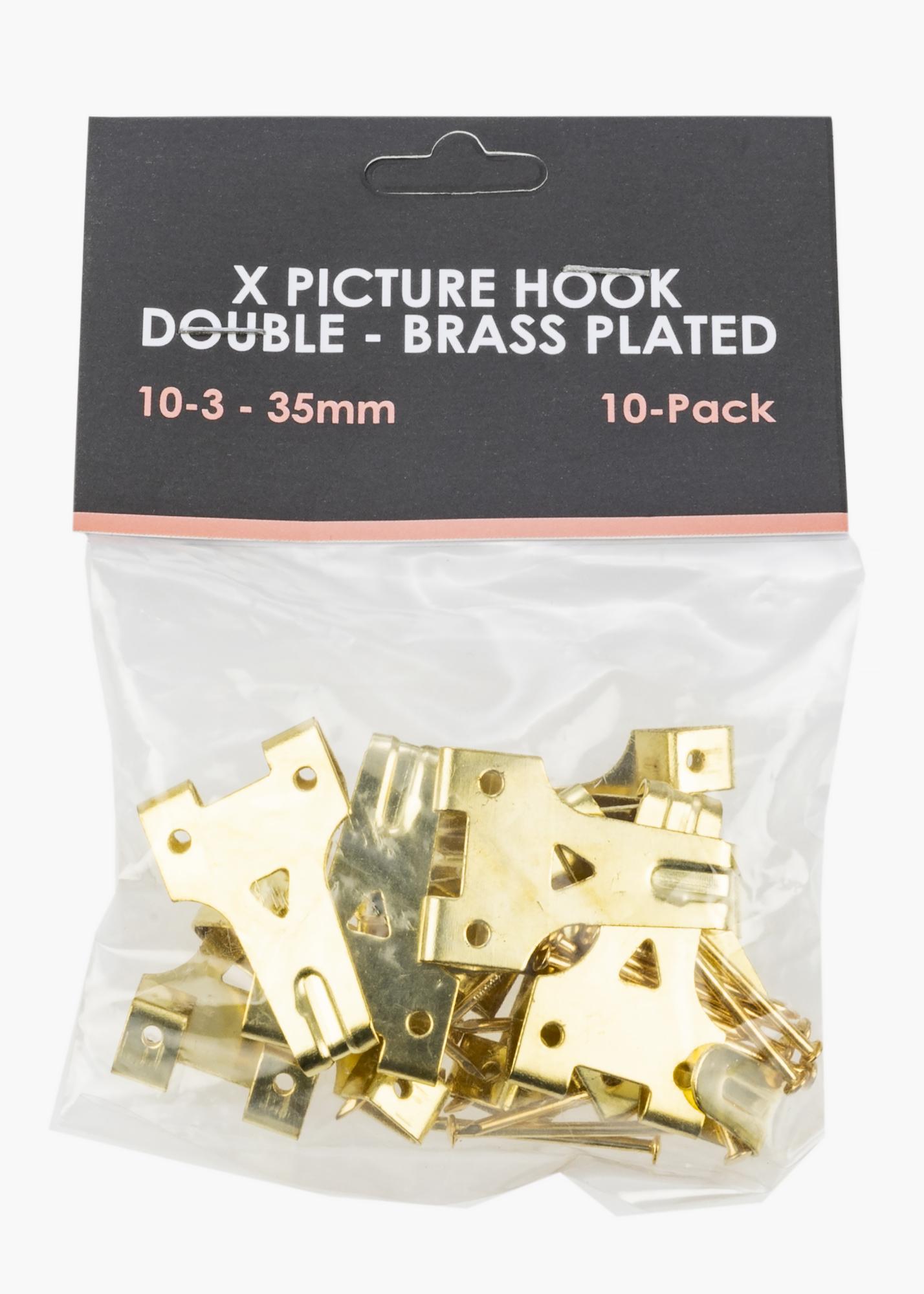 Cârlig dublu în formă de X pentru montaj pe perete de lemn sau gips. Suportă încărcături de până la 10 kg. Culoare alamă.