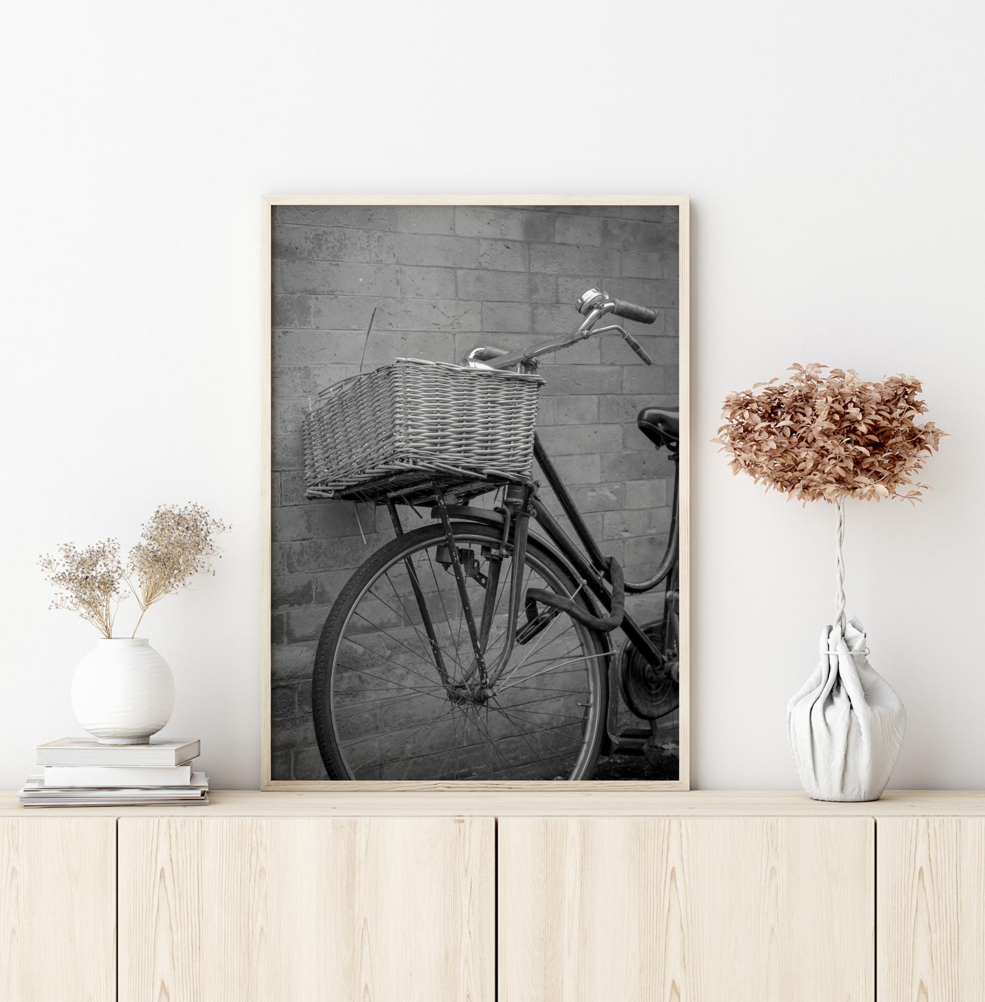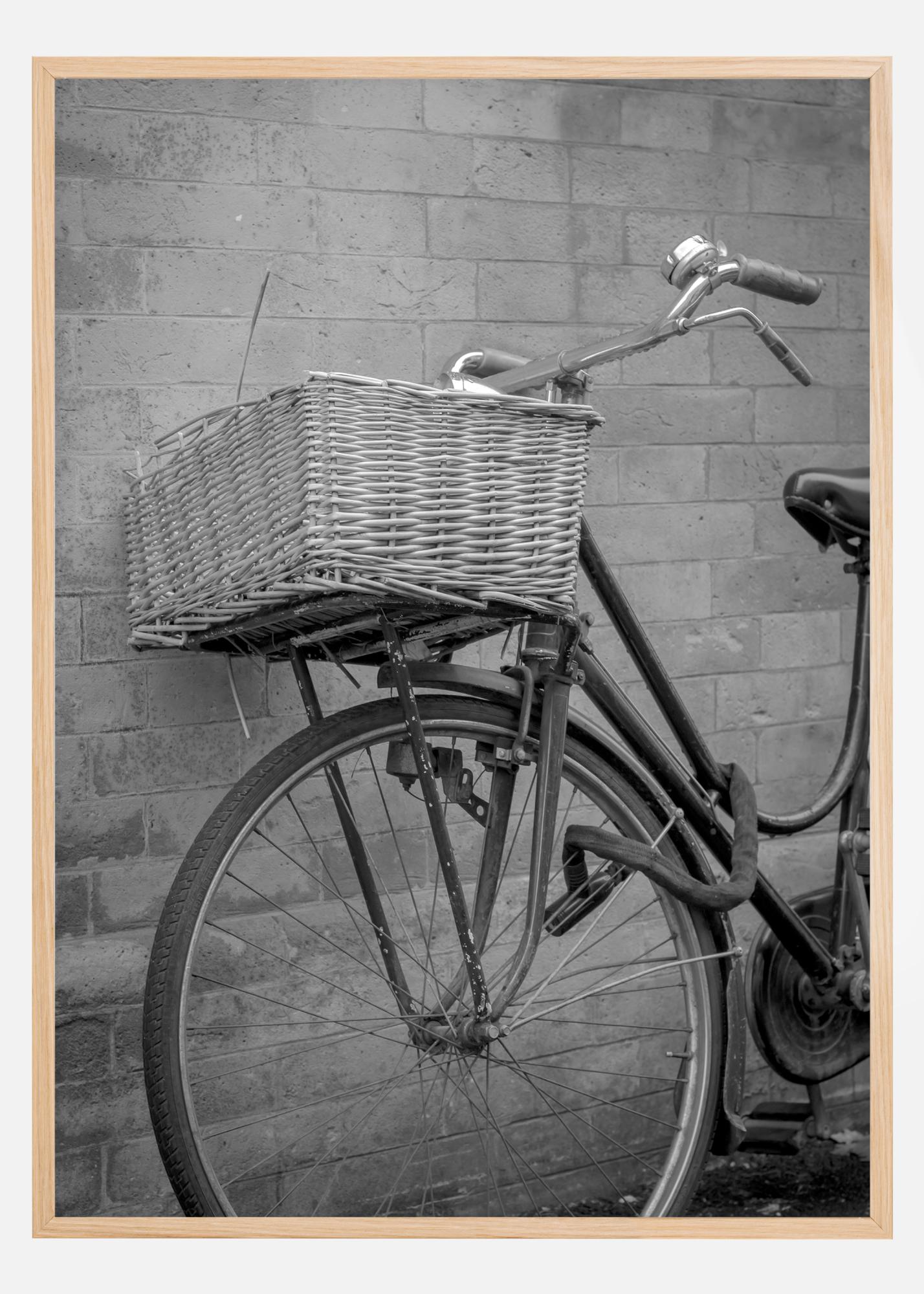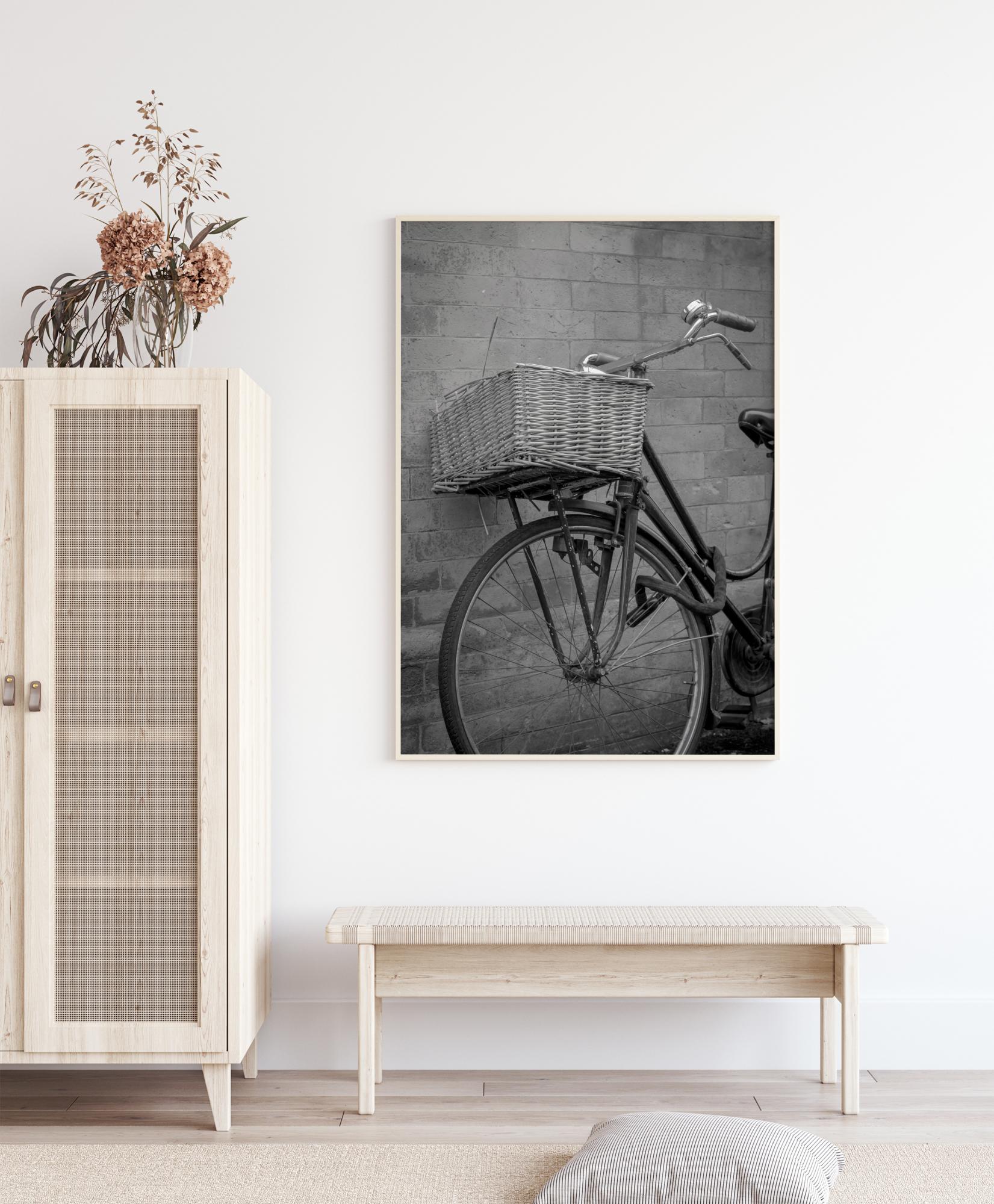 Un poster cu natură statică cu o bicicletă sprijinită de un perete de cărămidă. Coșul bicicletei este în prim-plan, iar rama neagră contrastantă și lacătul bicicletei direcționează privirea în jurul posterului. Afișează această imagine simplă, dar elegantă, pe un perete luminos pentru un efect rafinat.