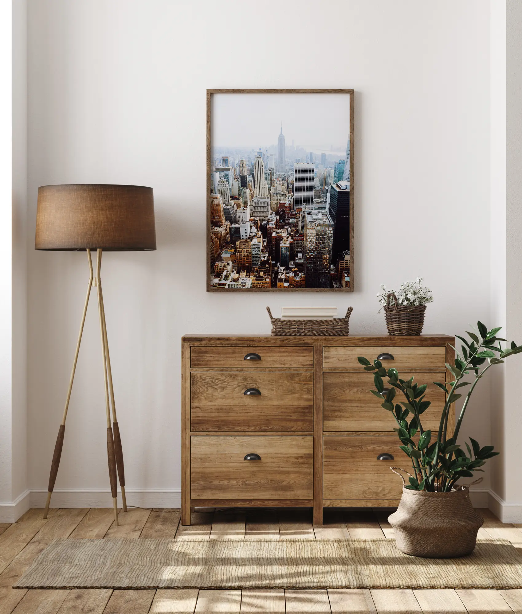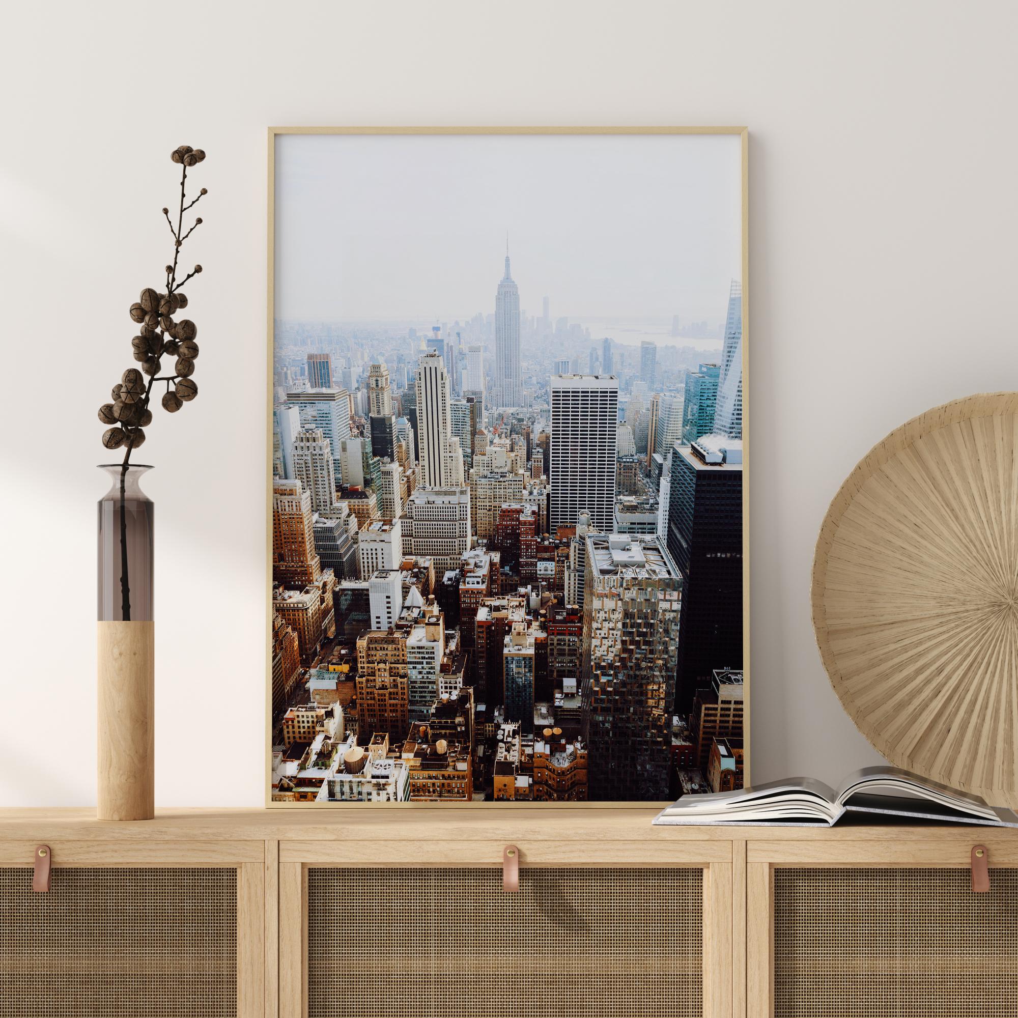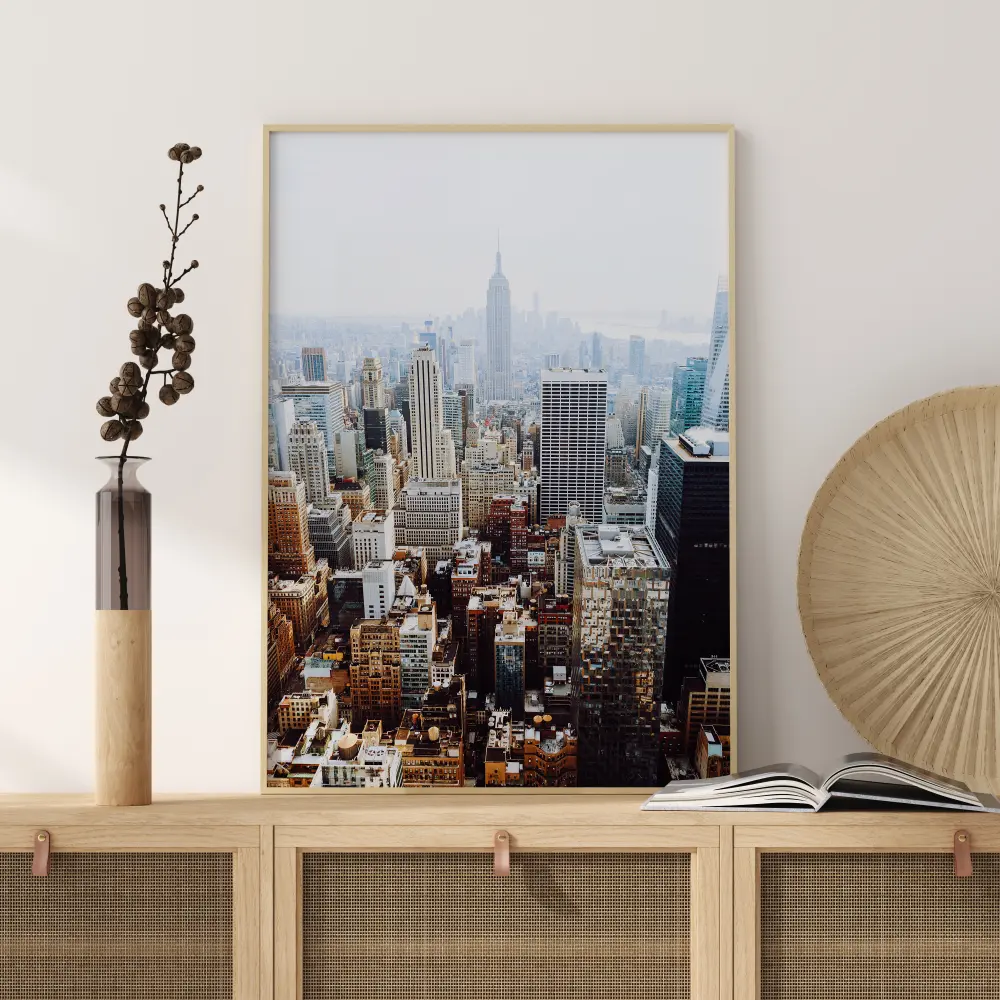 Un poster aerian cu centrul orașului New York cu Empire State Building în depărtare. În prim-plan, culorile încep ca auriu și galben înainte de a se contopi în fundal în tonuri mai reci de albastru și gri. Este focalizarea descrescătoare a imaginii care formează adâncimea. Adu această lucrare acasă și bucură-te de o expresie artistică a vieții urbane.