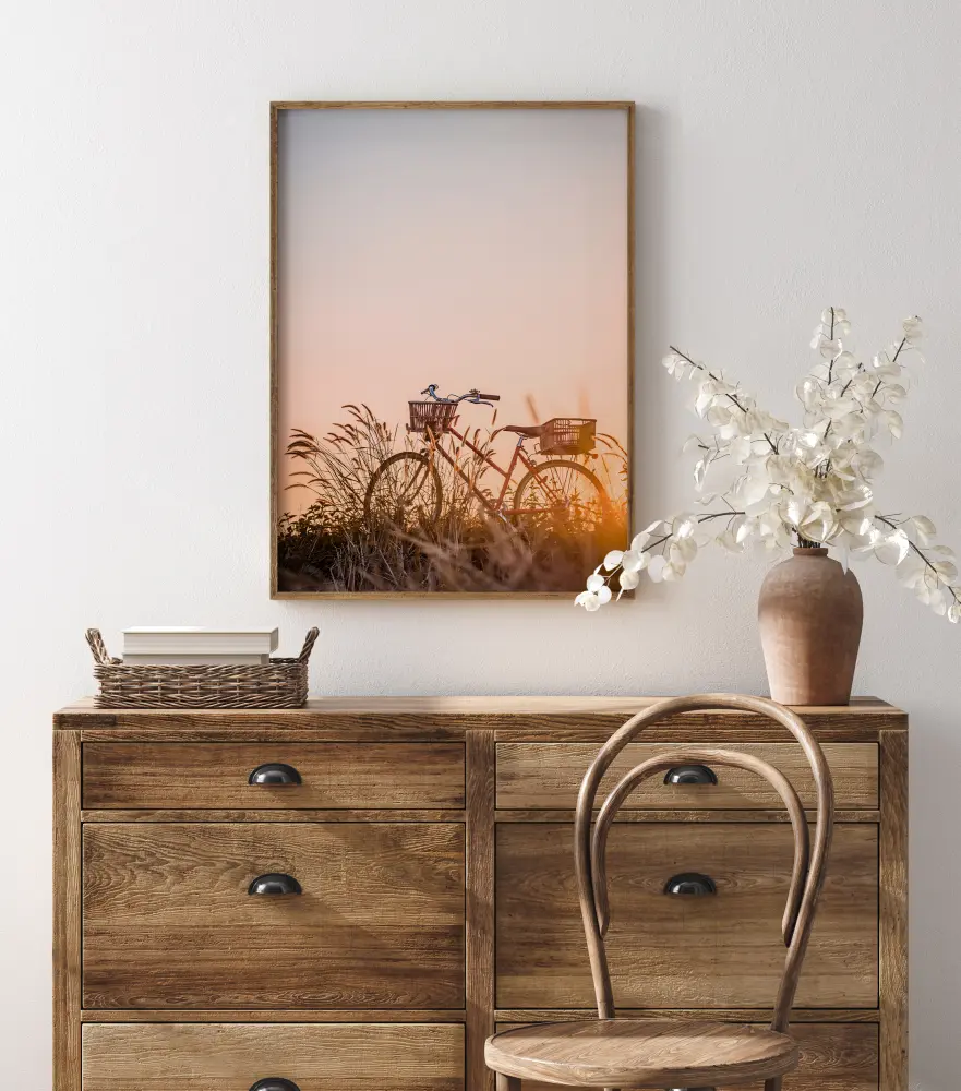 Un poster simplu cu o bicicletă pe un câmp de grâu. Această imagine magică devine mai eterică datorită soarelui care apune în spatele bicicletei și strălucește printre spicele de grâu. Cerul albastru clar reflectă apusul. Pune această operă pe perete și adaugă puțină liniște pereților tăi.